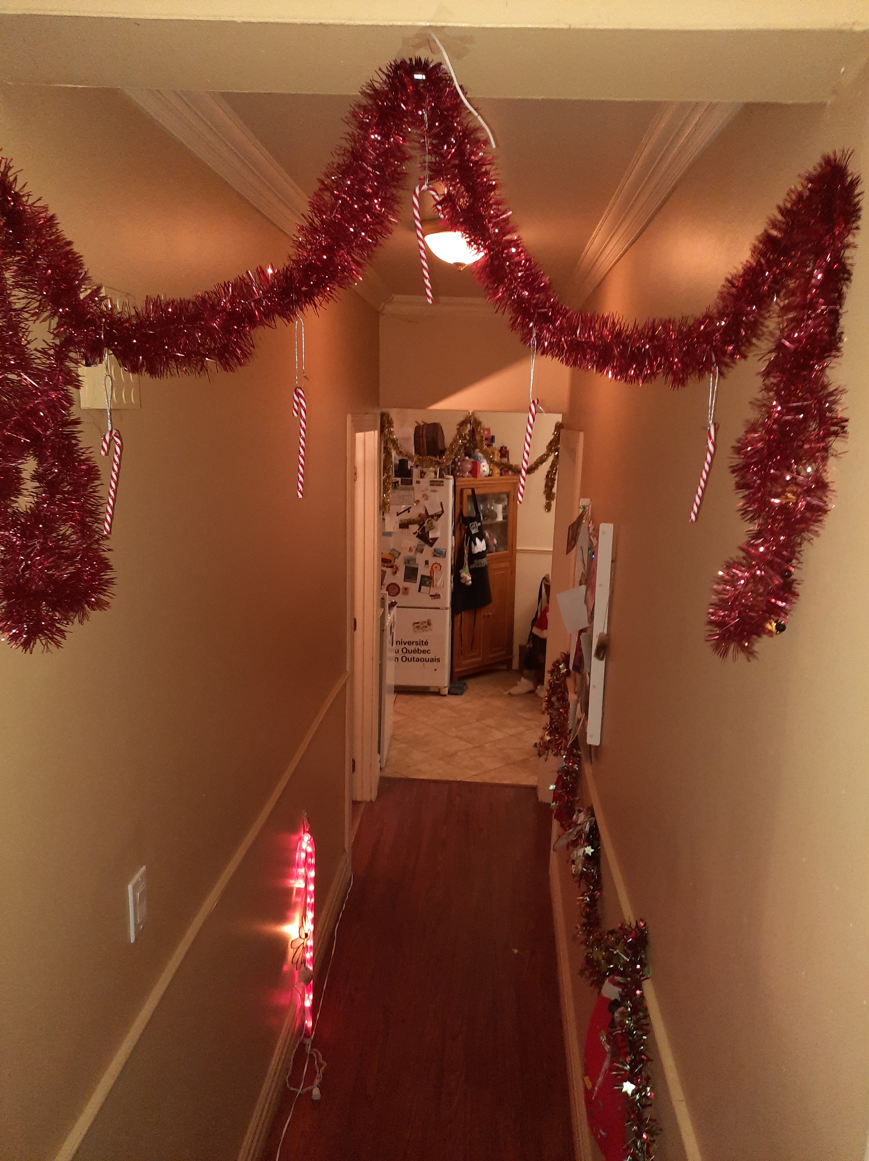 Une des mini-thématiques que j’inclus dans mon décor depuis l’année dernière est Candy Cane Lane ou l’Allée des cannes de bonbon, comme j’adore les bonbons et j’ai toujours aimé les couleurs et la forme des cannes. L’année passée, la canne de bonbon lumineuse ne fonctionnait pas (et pourtant, je l’avais acheté cette même année et testé une fois), mais je l’ai réparé cette année. Un petit bulbe de brûlée tout simplement. J’aime beaucoup transformer le couloir de notre appartement de la sorte. J’avoue que j’ai failli ne pas le faire cette année, puisque je craignais que cela remue des souvenirs tristes du dernier Noël avec Clément. Finalement, je suis heureuse de l’avoir fait. Ça m’apporte beaucoup de joie d’y défiler chaque jour.