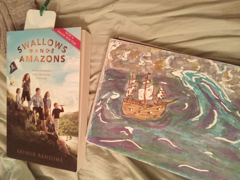 Le dessin qui apparaît sur la photo ci-dessus, à côté de Swallows and Amazons, est un croquis qui date de 2023 que j’ai retravaillé durant le mois de juin pour l’encrer et le coloriser. Je ne me doutais pas à ce moment-là qu’il serait aussi à propos, comme Swallows and Amazons finit sur une tempête de fin d’été. S’il y a même un peu de dessin dans mon mois anglais, c’est donc un hasard plus qu’autre chose ! Un heureux hasard.