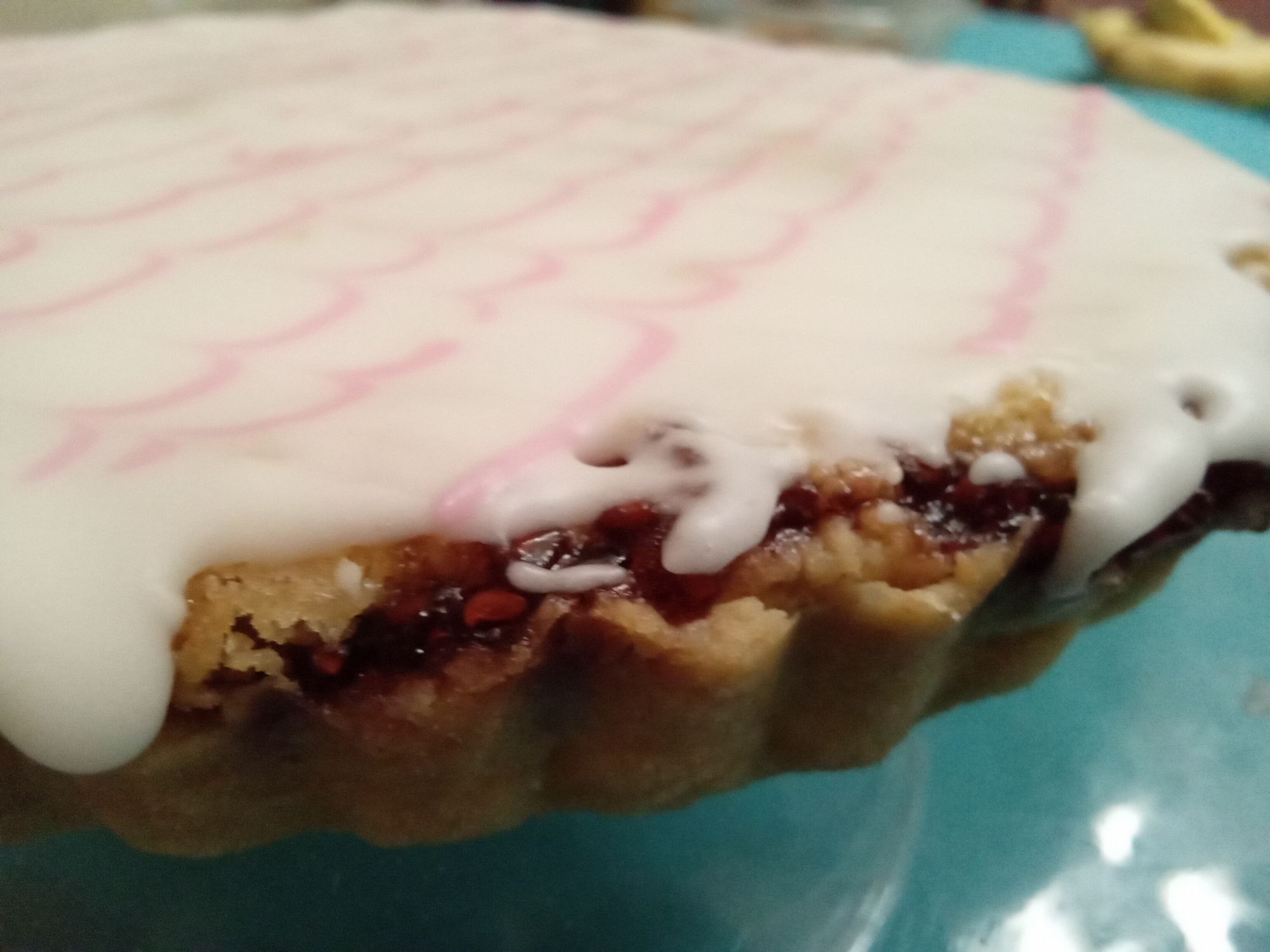 D’abord, commençons par le volet gourmand du défi qui a été encore une fois bien rempli. J’ai terminé sur une haute note mon mois anglais en préparant un dessert classique de l’Angleterre, une tarte Bakewell. Pour la réaliser, je me suis servie de la recette figurant dans le livre The Great British Bake Off Perfect Cakes and Bakes to Make at Home. C’est la recette de Mary Berry, qui avait été un des défis techniques de la saison 2016 de l’émission et dont vous pouvez aussi trouver la recette sur le site Web de l’émission. Je l’ai très bien réussi, pas parfaitement, mais je suis très heureuse du résultat. À l’heure où je prépare ce billet, elle a déjà été mangé jusqu’à la dernière miette. Néanmoins, je tiens à souligner que j’avais les instructions complètes sous la main et que je n’étais pas limitée en temps, contrairement aux participant-es de l’édition 2016. Si je suis satisfaite du résultat pour un premier essai, je note toutefois qu’il vaut mieux ne pas étendre la confiture jusqu’au rebord, car elle y sera poussée par la frangipane. Je pense donc qu’elle aurait été mieux répartie si j’avais laissé quelques centimètres entre le pourtour de la tarte et la confiture. Ma tarte est légèrement plus petite que celle de la recette, car je n’avais pas de moule de 23 cm. J’ai donc réduit la quantité de frangipane et de confiture étalée et diminué les quantités pour le glaçage.