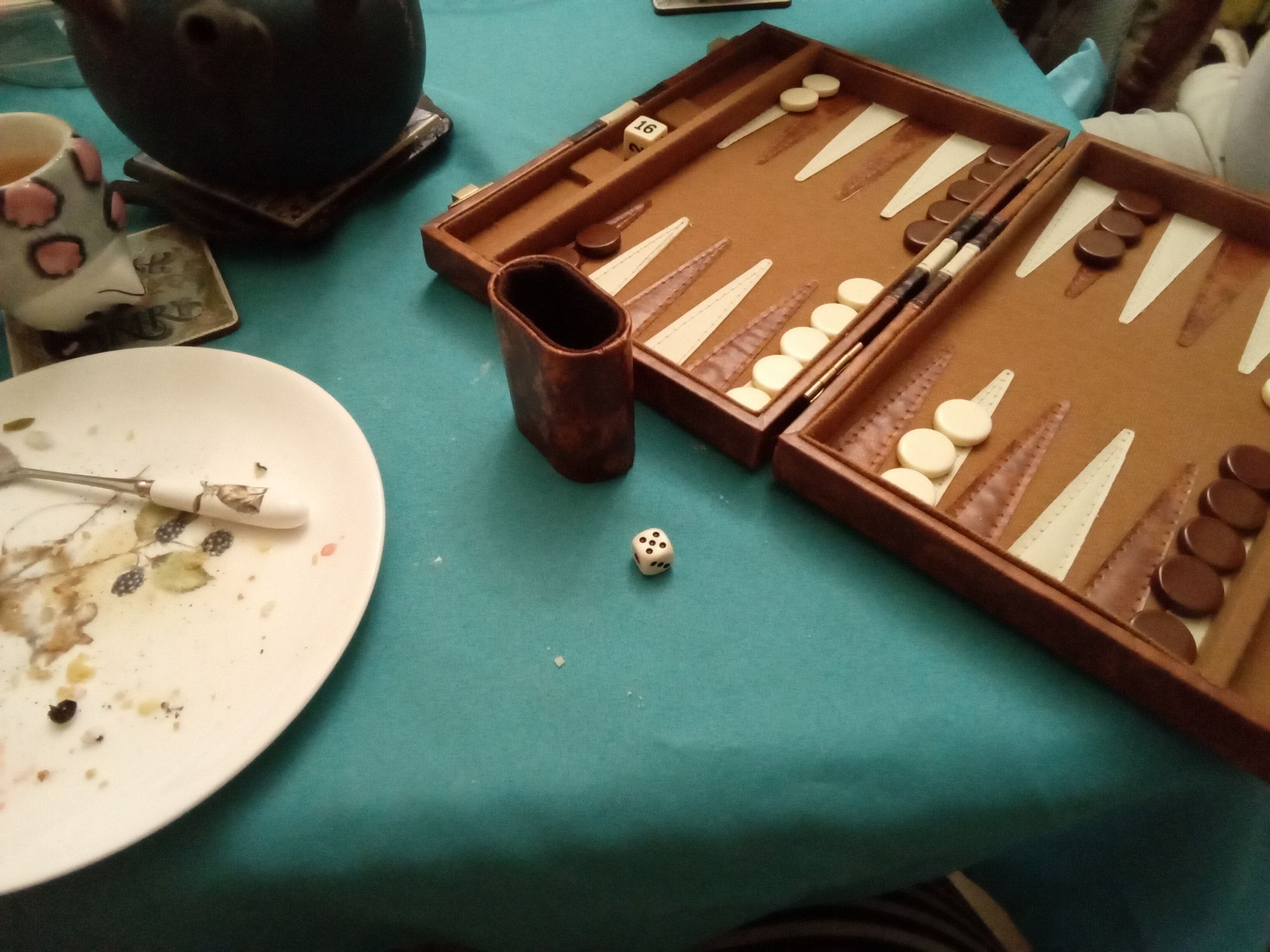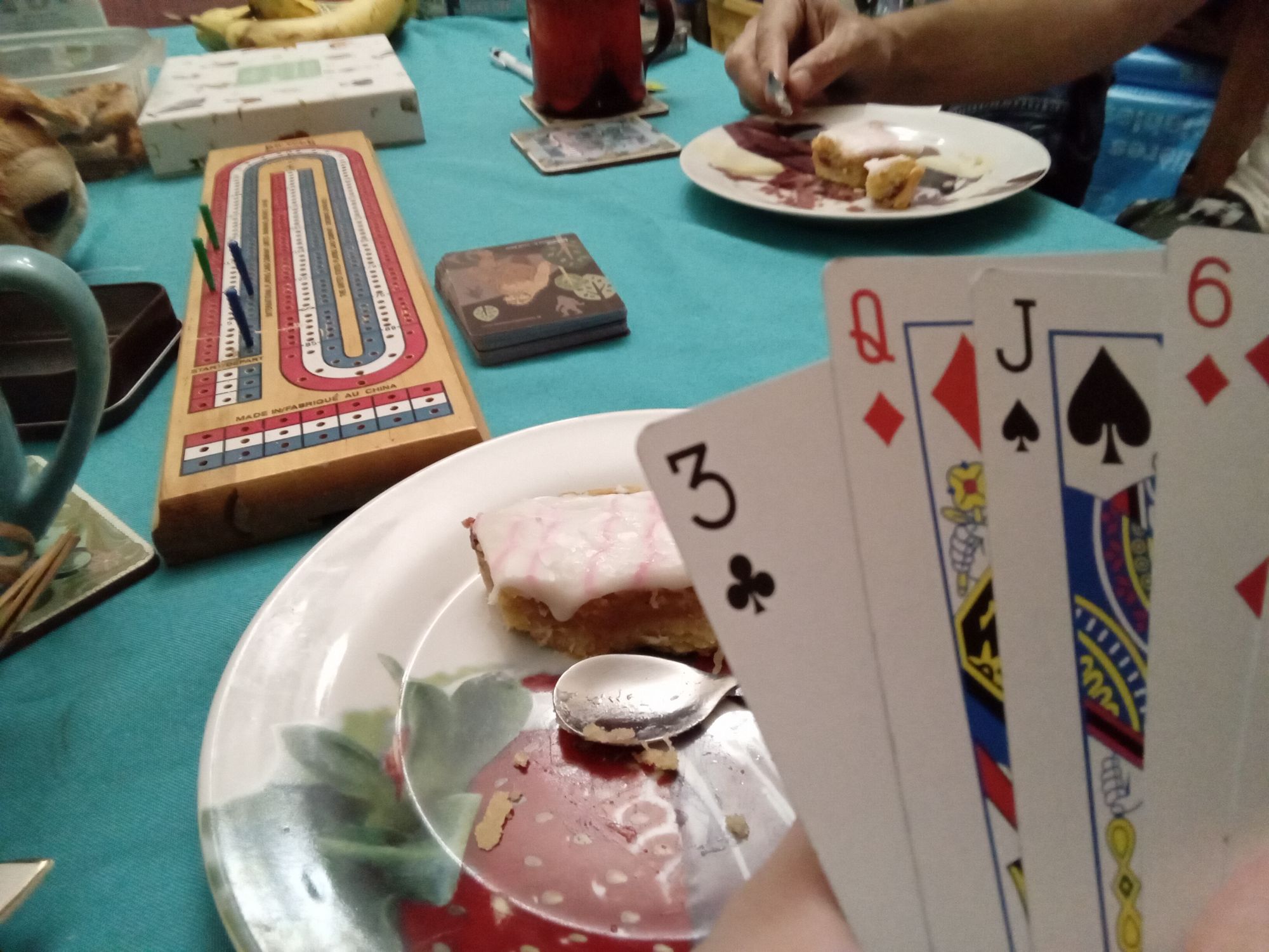 Le nombre de répliques permises est déterminé par la figure tirée (4 chances suivant un As, 3 suivant un roi, 2 pour une dame, et 1 seule pour un valet). Si l’autre joueur tire une figure dans les 1 à 4 cartes suivantes, selon la figure, c’est au tour du premier joueur de payer son dû. Dès qu’un joueur ne peut payer son dû, son adversaire raffle toutes les cartes tirées et les place sous son paquet. Le but est que l’adversaire n’ait plus de cartes du tout. Vous arriverez peut-être à le concevoir ainsi, une seule partie peut durer longtemps. Nous n’avons pas chronométré notre partie, mais elle adû dépassé au moins, au moins quinze minutes. J’ai passé plusieurs fois à la limite de perdre, dont une fois où il ne me restait que deux cartes, mais avec la bonne figure ce qui m’a permis de raffler le paquet. C’est arrivé à mon conjoint aussi, un peu moins souvent qu’à moi, quand même il lui en ai resté deux-trois dans son paquet au moins une fois. Au final, c’est tout de même moi qui ai perdu ! Nous avons également joué quelques parties de backgammon après notre afternoon tea. Avant dimanche, nous avions joué quelques parties de crib, un autre jeu d’origine anglaise, du moins, dans sa forme actuelle. Je n’avais pas identifié les jeux spécifiquement dans mon programme pour le Mois anglais, malgré que j’y avais pensé en recevant à Noël le jeu victorien. J’espère avoir l’opportunité de tester certains des jeux de groupe et pouvoir vous revenir sur ceux-ci d’ici juin prochain. Les jeux ont été un bel ajout à cette édition 2024 et ça m’a surtout permis de partager plus de moments de mon défi avec mon conjoint.