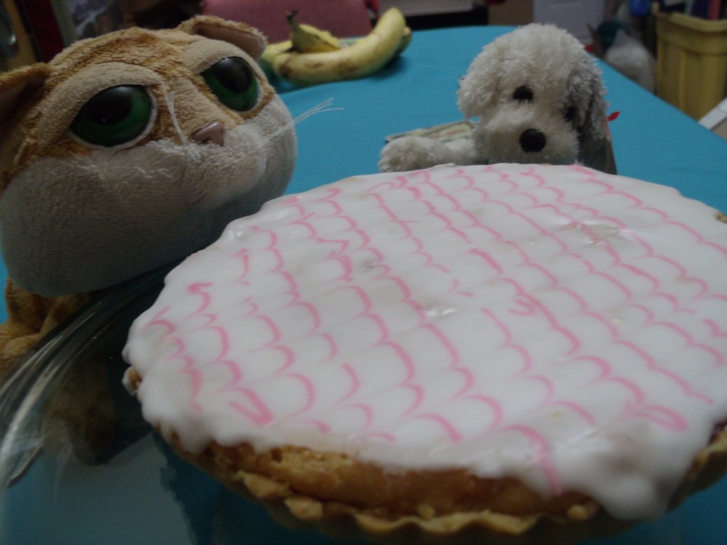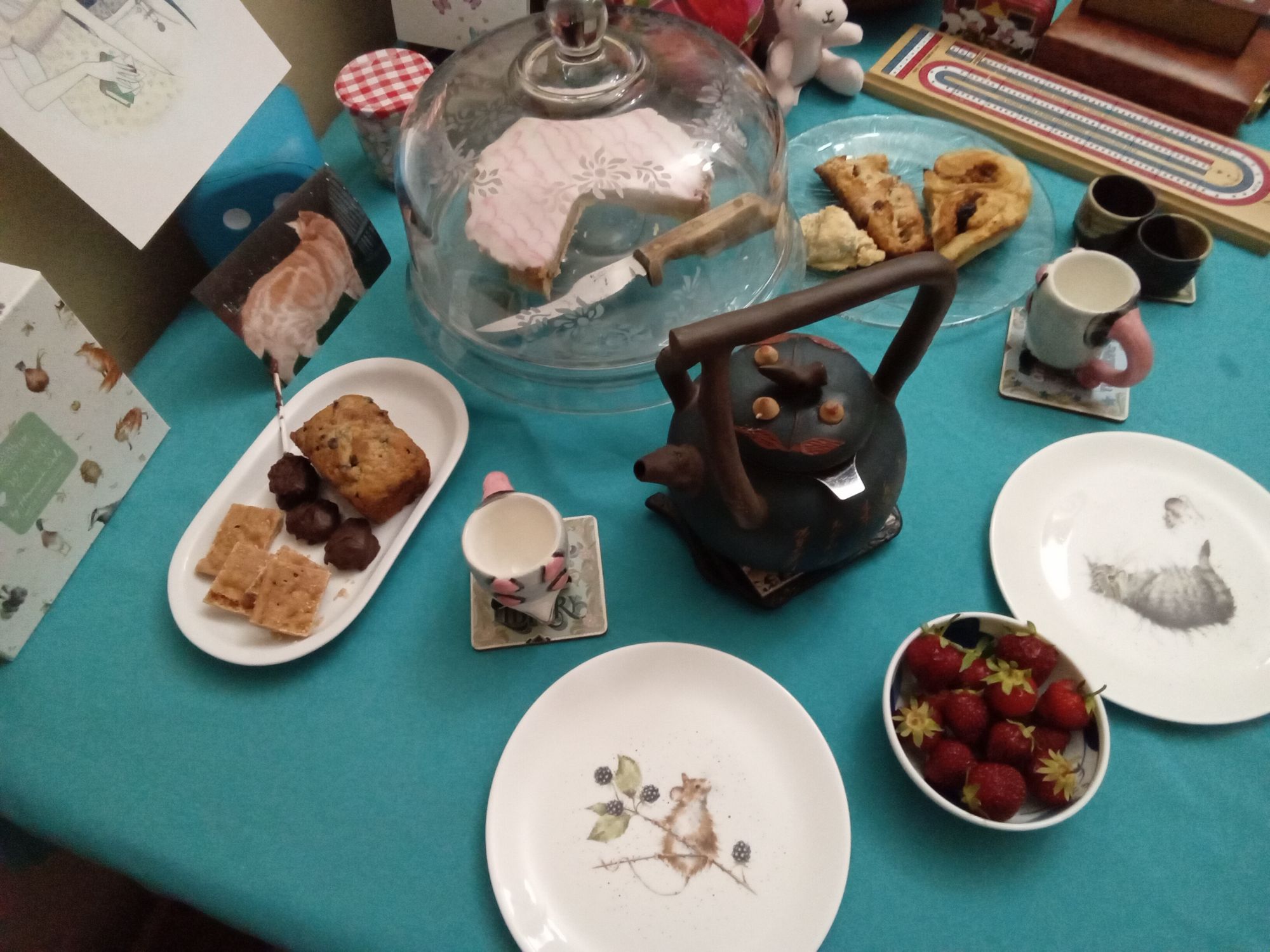 Samedi soir, après avoir fini la réalisation de la tarte, je me suis aperçue qu’il me restait des portions de quasiment toutes mes confections du mois anglais dans le congélateur, ce qui m’a donné l’idée de préparer un petit afternoon tea pour mon conjoint et moi le lendemain. Ainsi, j’ai sorti du congélateur les deux derniers Chealsea Buns, le dernier scone que j’avais préparé au tout début du mois anglais et un de ceux aux bananes que j’ai préparés le week-end dernier, j’ai aussi sorti un pain banane, bleuets et canelle que j’ai confectionné il y a peu, bien que ça ne fasse pas partie de mes réalisations gourmandes à l’anglaise. C’était pour compenser le fait qu’il me restait moins de scones que je pensais. Bien évidemment, trônait au centre la tarte Bakewell. J’ai assorti le tout de fraises fraîches et de quelques morceaux de mon butterscotch de la semaine précédente. Oh et j’oubliais que j’ai aussi sorti quelques-uns des cakes pop faits à partir du little pink rose cake. Juin a décidément été sous le signe de la gourmandise pour moi, on peut dire que j’ai bien profité de mon four réparé durant ce mois anglais !