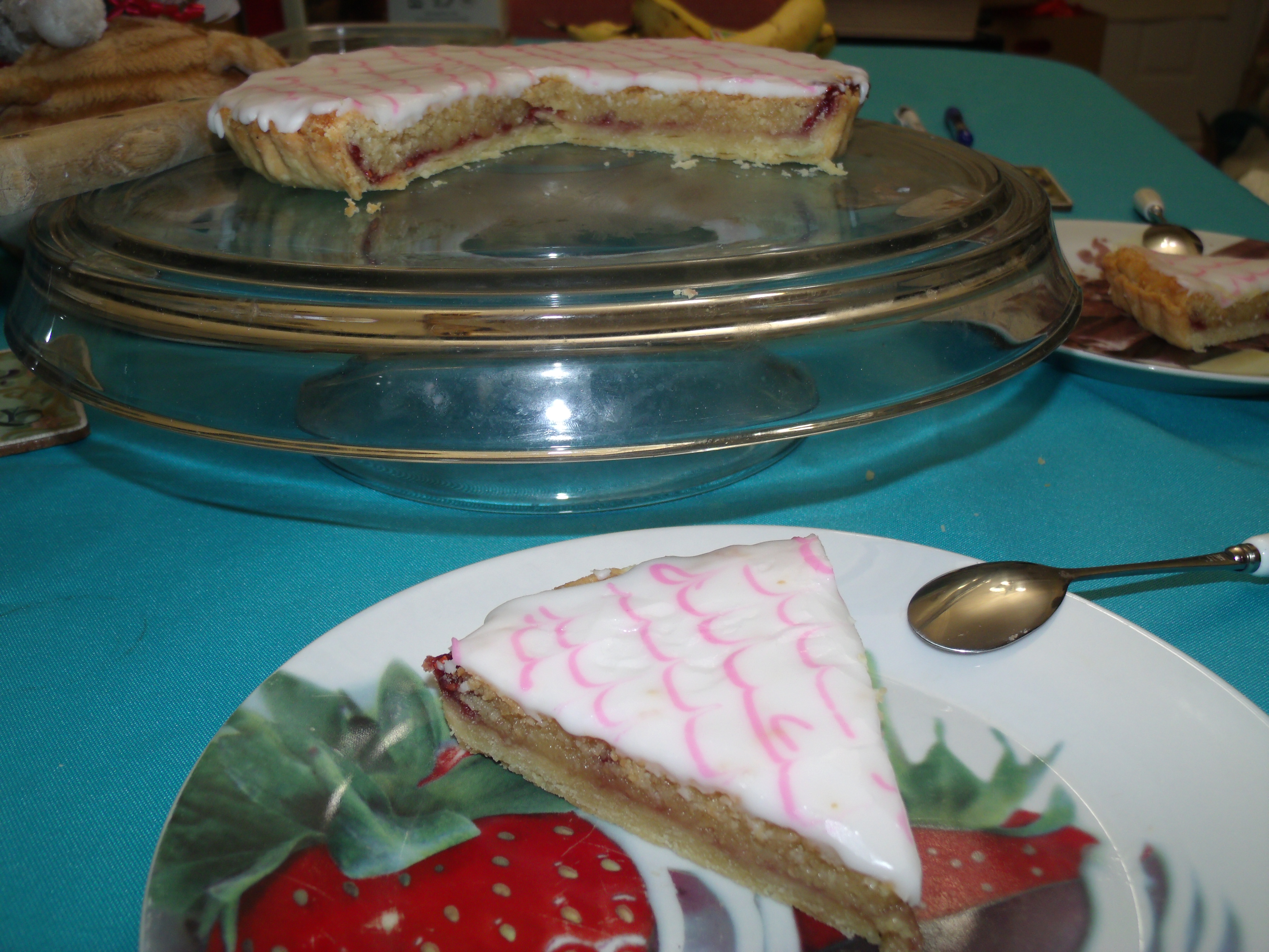 La Bakewell Tart est une évolution du Bakewell Pudding, une confection de crème anglaise et de confiture datant du XIXe siècle qui est servie sur une pâte feuilletée et aurait apparemment été créée par erreur, comme beaucoup de confections, et en toute vraisemblance, l’erreur se serait produit dans la communauté de Bakewell, dans le Derbyshire. Ce serait vers 1900 que la version en tarte aurait fait son apparition et elle consiste en gros en une pâte brisée sur laquelle on étend une mince couche de confiture, l’une des plus fréquences étant celle aux framboises, une couche généreuse de frangipane et soit des amandes finement tranchées ou soit un glaçage de sucre et d’eau. Lorsque décoré avec une cerise confite, ça devient une Cherry Bakewell Tart.