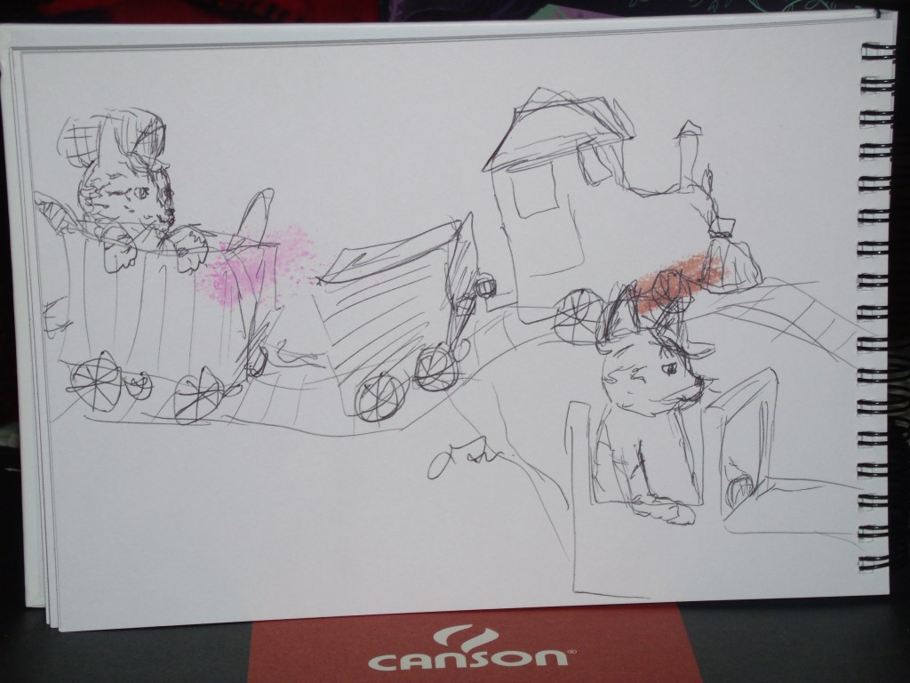Ça faisait un moment qu’une idée me trottait dans la tête, je pense que c’est vers la fin de l’hiver, après avoir remisé mon petit train de Noël, que l’image de Clément faisant un tour de train m’est venue en tête. Les trois ébauches que je vous présente ci-dessous constituent mes premiers essais pour réaliser cette vision. Je ne suis pas encore tout à fait satisfaite, mais je me suis bien amusée à imaginer, sous mon crayon pour le premier et sous mon stylo pour les suivants, Clément faisant un tour de train, dans un wagon ou une locomotive. Il y a de fortes chances que vous en voyez d’autres versions dans la prochaine année. Je dis prochaine année, parce que je ne sais pas quand je poursuivrai ce projet. Je sais simplement que l’intention est là.