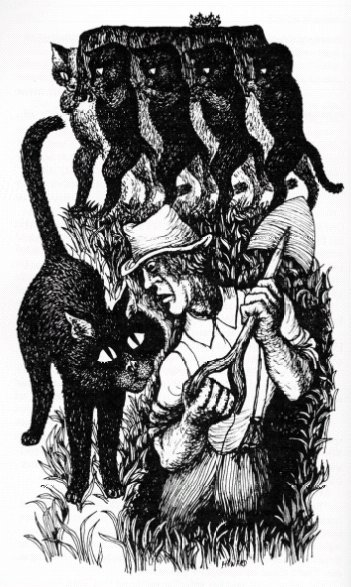 Je parle d’une légende celte, qu’on retrouve autant en Écosse qu’en Irlande, d’un chat-fée noir, le Cait Sìth ou Sidhe. J’ai cherché à identifier quelle graphie provenait de où (ça se prononce de la même façon autrement, lire comme shee), mais j’ai trouvé des informations contradictoires et aucune source semblait franchement supérieur que l’autre. Je vais écrire après cela Sidhe tout simplement, question d’en choisir une forme. Les Cat Sidhe sont des chats noirs qu’on peut distingue des chats noirs normaux par leur immense taille pour un chat et par la présence d’une tache blanche sur leur poitrail ou près du cou. Les Cat Sidhe avaient plutôt mauvaise réputation, puisqu’on disait d’eux qu’ils volent les âmes des personnes récemment décédées qui n’ont pas encore eu le temps de traverser dans l’au-delà. Pour se nourrir, ils se tiendraient près des lieux où ces âmes se trouvent, les cimetières principalement. D’ailleurs, il y avait un rituel funèbre écossais pour empêcher les Cat Sidhe de perpétrer leurs méfaits. Un garde spécial veillait sur les corps devant être prochainement enterrés, le Fèill Fhadalach. Selon ce que j’ai trouvé ces gardes distrayaient les Cat Sidhes pour détourner leur attention de la sorte : « They played games, and wrestled, and played music, and danced, and told riddles in order to distract the Cat-Sìth and keep them away until the time of the burial. » (Source de la citation : Folklore Scotland). Comme nos chats domestiques, l’attention des Cat Sidhes semble de courte durée.