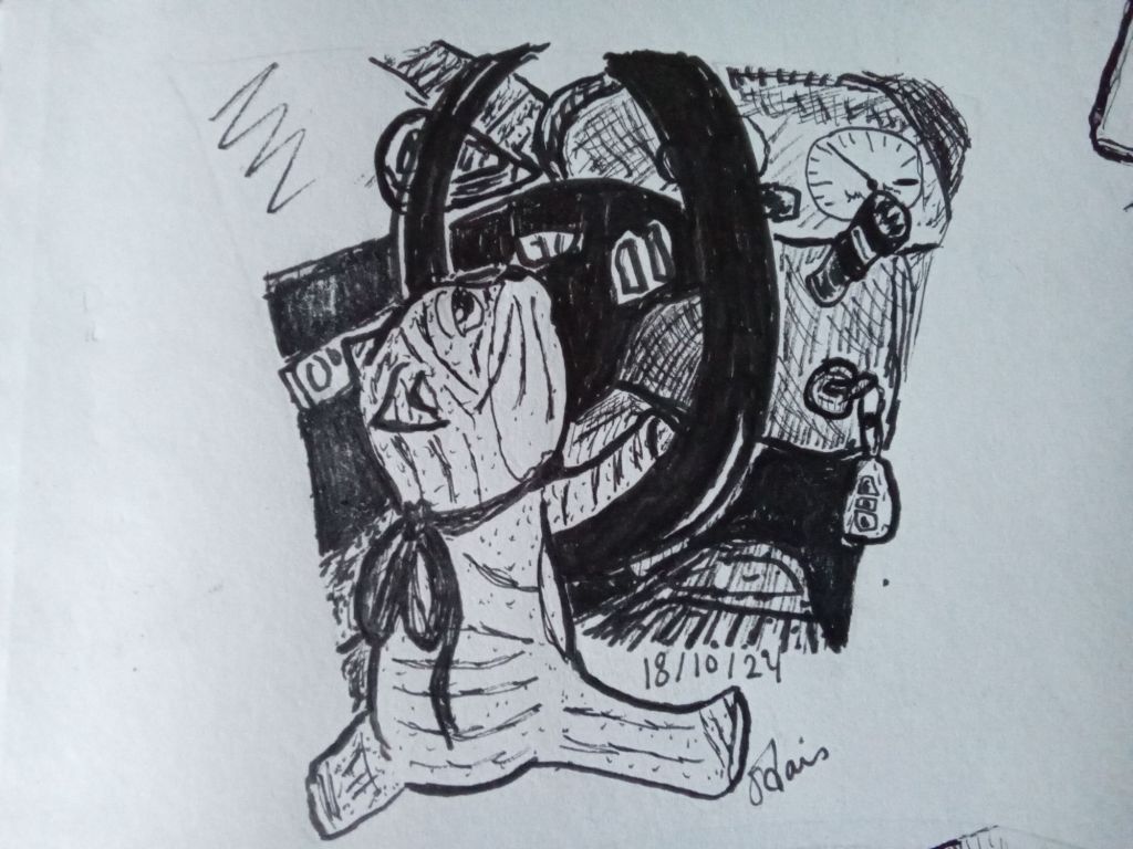 Ma troisième page est ma moins préférée d’un côté, je l’admets, mais d’un autre, j’en suis très contente comme j’ai varié les sujets et les défis. J’ai eu de la difficulté avec plusieurs des mots-clés, dont grungy (crasseux), journal, ridge et même rhinocéros. Même si l’idée pour ce dernier m’est venu assez vite, la mettre en pratique a été autre chose. C’est peut-être ma moins préférée, parce que la moins féline du lot, remarquez… N’empêche que je me suis beaucoup amusée à explorer de nouveaux sujets, à jouer avec mes Copics, mes plumes, les textures et les motifs. Sur le lot, mon favori est celui représentant Clément II pour le thème conduire/conduite. Ça peut paraître évident comme sujet pour représenter ce sujet, pourtant, je n’y ai pas pensé sur le coup. Ça m’a pris un moment à rapprocher le thème du 18 octobre à un épisode récent des aventures de Clément II et moi où je l’ai placé au volant de la voiture, celle-ci était stationnée je précise. Je me suis servie d’une de mes photos de l’événement pour esquisser le dessin. J’avoue qu’ici, sans référence, ça n’aurait pas été aussi détaillé. J’avais d’ailleurs jeté un premier croquis sans photo et ce n’était pas tout à fait cela. Je n’avais pas prévu déborder du cadre, mais quand je me suis rendue compte qu’on ne verrait pas ses pattes suspendus dans le vide, je trouvais que ça n’allait pas tout à fait. Ça ne rendait pas tout le comique de la scène. Alors, j’ai fait débordé le cadre pour Clément II seulement, et le déverrouilleur à distance.