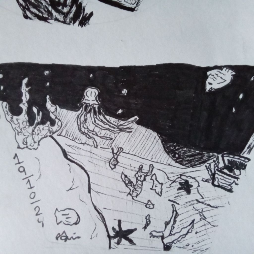 Un autre qui m’a donné du fil à retordre est celui du jour suivant « Ridge ». Je n’avais aucune idée de comment je représenterais ce mot-clé. Quand je ne sais pas par quoi commencer, je me plonge dans la définition du mot et c’est là que j’y ai trouvé mon idée. Voyez-vous, des chaînes de montagnes sous-marines sont désignés comme des oceanic ridge. Adorant les créatures sous-marines, ça m’est paru une bonne occasion de tenter d’en dessiner un peu. Ça manque un peu de détails et j’ai oublié d’y inclure un poisson-chat, cependant, ce n’est pas le genre de scène que j’ai l’habitude de dessiner, encore moins d’encrer, et je l’ai fait sans référence visuelle. Un premier essai intéressant, il faudrait que je retente un autre jour, avec quelques références visuelles. C’est aussi pas tant facile de représenter le monde sous-marin en noir et blanc…