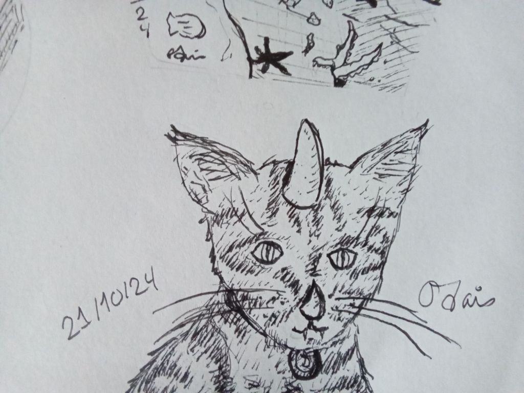 Ensuite, un artiste japonais que je suis depuis quelques temps, @oekaki_nyansuke, y participe à son rythme également sur Instagram. Cet artiste dessine des personnages félins adorables, drôles et attachants. Son Inktober poursuit donc sur cette lancée. J’adore son style, souvent teinté d’humour et de mignonnerie, parfaitement à l’image des chats mis en scène.