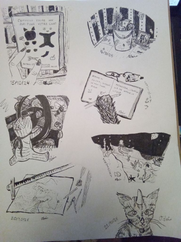 Le dernier sur lequel je veux attirer votre attention est celui du 21 octobre qui clôt cette troisième page, représentant une chimère inspirée par le mot-clé du jour, rhinocéros. Le chat ressemble à Clément, je l’ai définitivement pris comme modèle, mais je précise que c’est vraiment une chimère que j’ai représentée au final, quoi qu’au départ, l’idée de base était un chat avec un déguisement de rhinocéros. En commençant à l’esquisser, ça a viré en chimère tout simplement. Comme ça sort de mon imagination, j’imagine que la différence est plus sémantique qu’autre chose. Il est plus petit que les autres jours et pas cadré, il me restait juste assez d’espace que je ne voulais pas laisser rn blanc. D’ailleurs, sur cette troisième page, à part le premier qui est assez gros, les autres sont de taille assez petite, un peu comme les trois dernières images de la deuxième page que je vous ai partagée un peu plus tôt cette semaine. Pour la quatrième page, j’ai décidé de faire des cadres un peu plus grands. En général, ça ne me prend pas tant de temps à dessiner et encrer le tout, alors, un peu plus gros, ça me semblait faisable. Il demeure qu’il y en a 5 au total sur cette avant-dernière page de mon Inktober que je viens de finir ce soir et je peux d’ores et déjà vous dire que les chats y sont revenus en force.