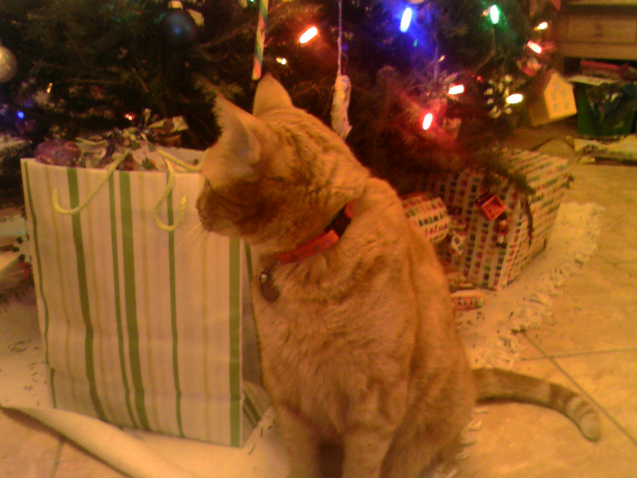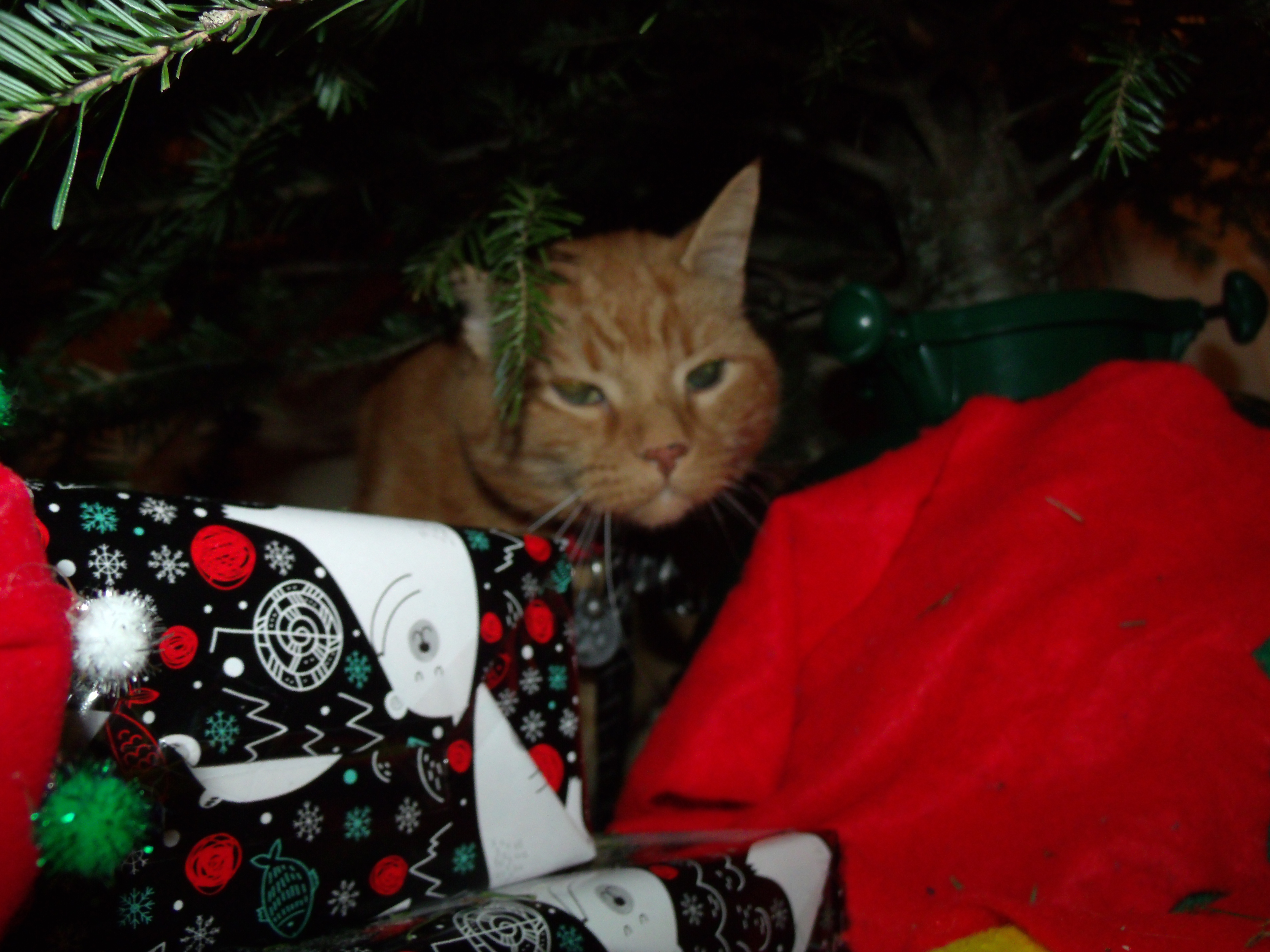 Mon mois de décembre ne s’est pas déroulé tout à fait comme je pensais. Je croyais que cette année, j’arriverais à vous raconter un peu plus sur les Noëls de Clément, ce dont je vous ai à peine entretenu l’an passé. Finalement, ce n’est pas arrivé, sauf que les raisons n’étaient pas les mêmes qu’en 2023 où c’était surtout causé par un blocage émotif lié à mon deuil. En 2024, ce sont d’autres aspects de ma vie qui m’ont rattrapé. Pas qu’il n’y avait pas une charge émotive autour de cette deuxième période des Fêtes sans Clément, seulement, je suis plutôt certaine qu’elle n’a pas joué un rôle significatif dans mon ralentissement sur la Miaougraphie de Clément en décembre. Pour compenser un peu ce manque d’histoires festives de notre vieux chaton, je vous offre ces quelques photos de lui qui semblent fouiller, lors de trois Noëls différents, dans les cadeaux sous le sapin. Il était pourtant assez sages avec les cadeaux sous le sapin, tant qu’il n’y avait pas trop de rubans frisottants ou de papier de soie qui dépassaient !