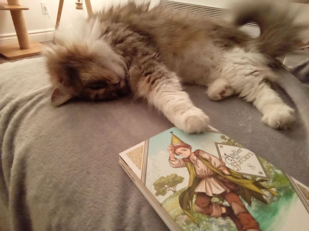 J’envisageais depuis un moment de me concocter une thématique de lecture toute en grâce féline. Vous pouvez sans doute imaginer la quantité de choix que j’ai dans ma pile à lire pour un tel thème. Dans les deux ans suivant la mort de Clément, j’avais bien fait quelques lectures avec des chats comme personnages principaux ou secondaires très près des principaux, mais souvent très espacées, n’étant pas certaine de pouvoir supporter émotionnellement d’en lire plusieurs de suite. Cet été, je me sentais prête à peupler mes moments de lecture de chats de toutes sortes. C’est ainsi que j’ai enfilé presque d’une traite Cat + Cat adventure (tome 3), Plum Un amour de chat (tome 14), The first Cat in Space ate Pizza (tome 1), Sailor Moon (eternal edition tome 3), Waffle and Pancake (tome 1) et Les chats du hasard que j’avais justement acheté l’été dernier (2024) lors de ma première visite à la librairie Black Cat Books (que j’ai revisité cet été aussi). Il y en a eu quelques-unes par après, éparpillées parmi d’autres dont le tome 2 de Waffle and Pancake, Nyaight of the Living Cats 2 et 3, Le manoir de Castlecatz 1 L’automne des aspirants, les tomes 10 et 11 (Perfect edition) de Fruits Basket, The Cat among Us , et le tome 4 de Sailor Moon (toujours la eternal edition). Toutes ces lectures ont été excellentes et sont susceptibles de plaire à tous les amoureu-ses des chats.