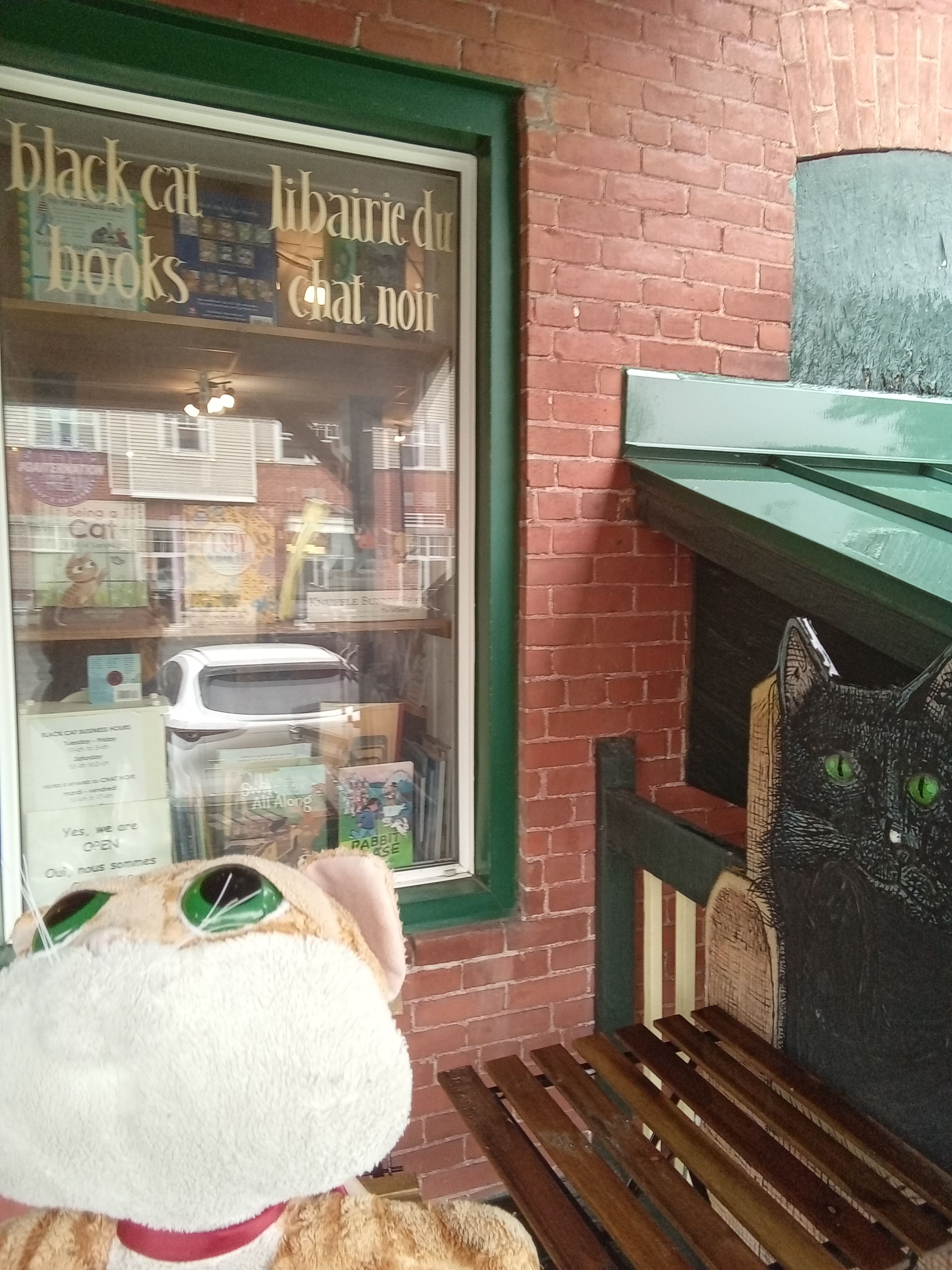 Avant que Gigi trouve son chemin vers nous, Clément II a été le chat de l’été, accompagnant mon conjoint et moi durant de nombreuses escapades, en camping, en petite promenade, au chalet, du Bas-St-Laurent à Montréal, en passant par l’Estrie. Dans cette région où nous allons plus fréquemment depuis que ma plus jeune soeur y a emménagé, nous avons fait une deuxième visite à la librairie Black Cat Books et cette fois, Clément II a eu droit à son portrait devant ladite librairie. Pour une deuxième année, j’y ai trouvé, entre autres choses, un livre ayant un chat dans le titre et sur la couverture, déjà lu et mentionné ci-dessus, The Cat Among Us de Louise Carson. Je pense que ça sera ma tradition à chaque visite dans cette librairie que de trouver et d’acheter au moins un livre avec chat dans le titre ainsi qu’un chat sur la couverture.
