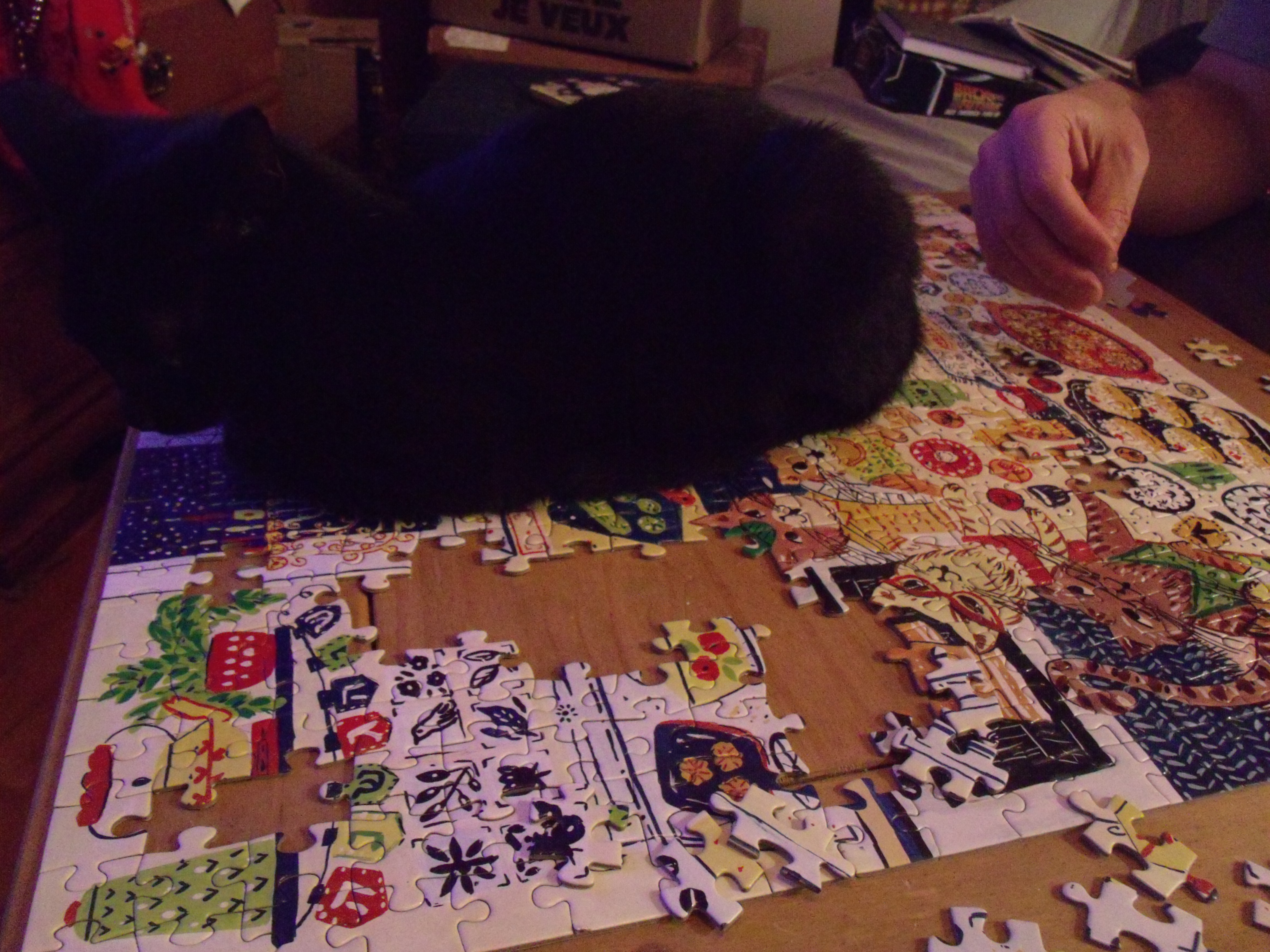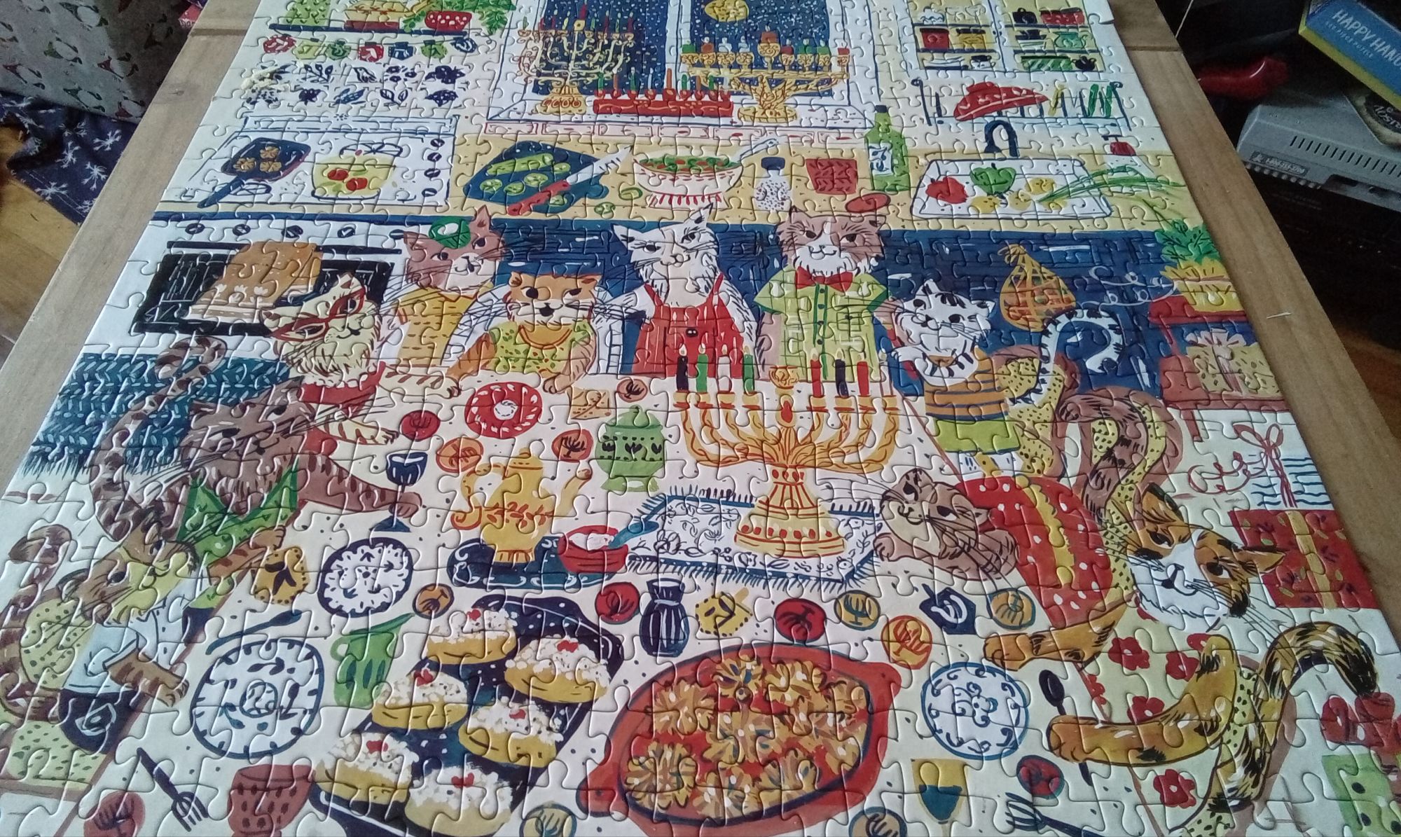Pour conclure l’année du chat en beauté, j’ai déniché quelques trucs pour célébrer les Fêtes miaou-veilleusement. Je ne pensais pourtant pas spécifiquement au fait que j’avais décrété en 2023 que 2025 serait l’année du chat, c’était simplement pour souligner le premier Noël avec notre charmante Giselle. Je nous ai acheté l’album Cat Family Christmas Advent Lift the flap de Lucy Brownridge et illustré par Eunyoung Seo. Nous n’avons pas tout fait suivi le rythme de l’Avent et l’avons fini un peu après Noël, mais quel bel ouvrage ! Comme nous sommes une famille interculturelle, Gigi a aussi souligné son premier Hanou’chat. Alors, quand j’ai repéré ce puzzle Happy Hanukcats de Gallison (illustrée par Anna Ivanir) de 500 pièces, je me suis dit que ça serait une belle activité à faire en famille durant les huit soirs d’Hanouka. Je pense que ça pourrait devenir une nouvelle tradition, peut-être pas de refaire le même puzzle chaque année, quoi que je suis sûre que nous aurons envie de refaire celui-ci, mais d’en faire un petit sur la durée des festivités. Ce puzzle est resté sur la table de salon plusieurs jours après l’avoir fini. Nous l’avons éventuellement rangé, car Gigi avait pris le tour de soulever les pièces du coin et nous commencions à les trouver de plus en plus loin de la table. Il valait mieux le ranger pendant que nous avions encore toutes les pièces…