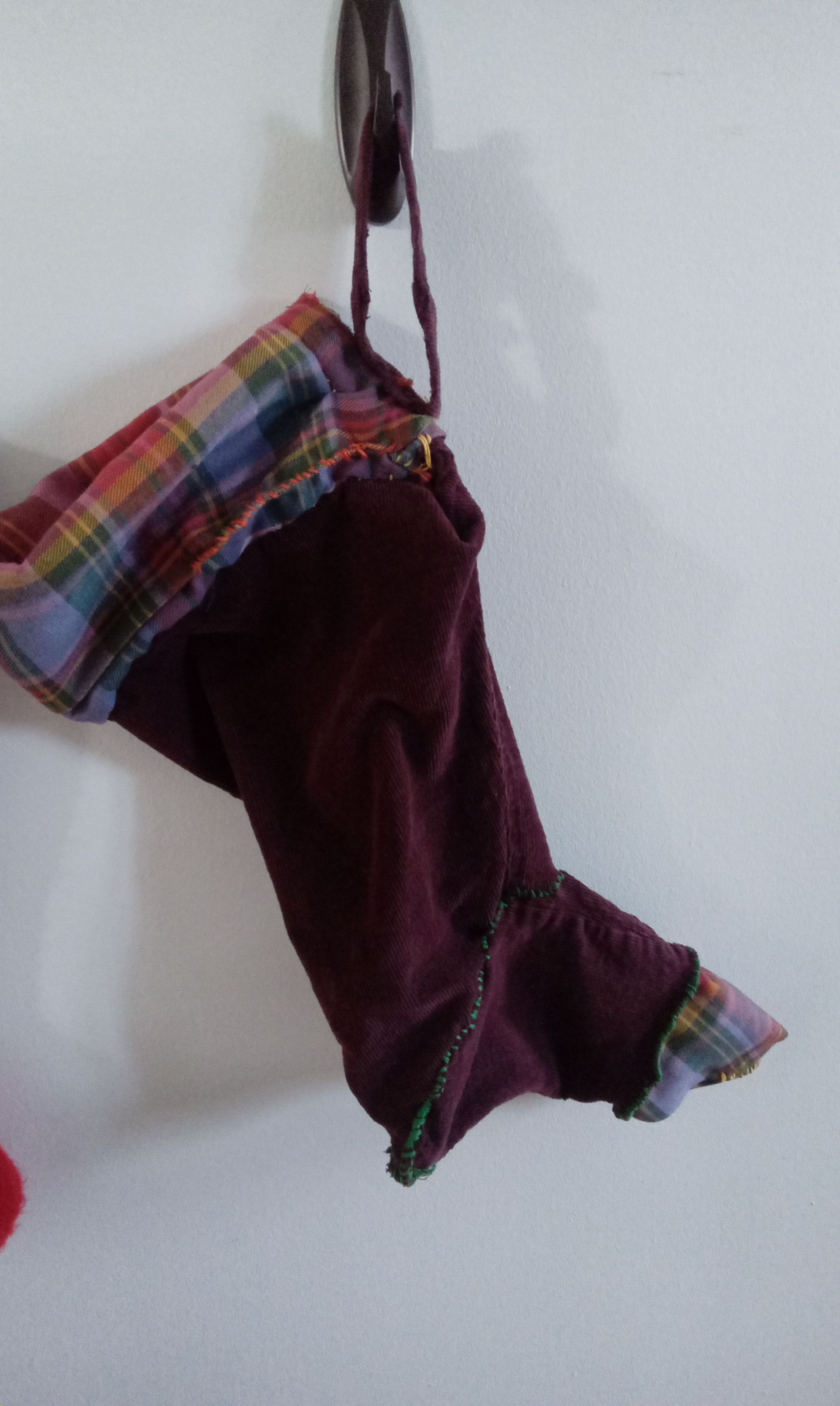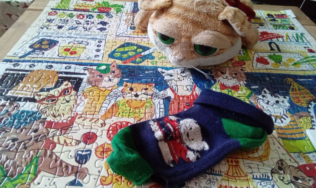 Je pense qu’il est normal que je vive de nouvelles expériences avec Gigi autant que de similaires de celles vécues avec Clément. Ils n’ont pas le même tempérament tout à fait et surtout, je ne suis plus l’étudiante paumée et la récemment diplômée tout aussi paumée que j’étais pour plus de la moitié de la vie de Clément. J’ai également énormément appris sur les félins en quinze ans avec son grand frère et durant les presque trois ans qui les séparent tout deux. Cela étant dit, j’ai eu une idée pour contrebalancer quelque peu ce sentiment en ce qui concerne les bas de Noël : fabriquer un petit bas de Noël décoratif pour Clément pour chaque Noël qu’il n’en a pas eu. Au final, je pense en faire une guirlande que nous pourrons accrocher quelque part chaque année. J’espère trouver des tissus et des décorations pouvant également évoquées chacune de ces années. J’en ai fait un premier tout simple, à partir d’un vieux bas troué au motif festif que j’ai eu vers la fin de mon adolescence et que je suis pas mal certaine que je portais encore lors du premier Noël avec Clément. Je l’ai accroché avec les nôtres qui ne sont pas encore rangés (mais le seront sous peu). Je l’ai terminé avant le 6 février. J’espérais en faire un ou deux de plus pour le 6, ce n’est pas arrivé par manque de temps et autres priorités. Voilà, le mélange de légèreté et de lourdeur qui a surplombé notre premier temps des Fêtes avec Gigi.