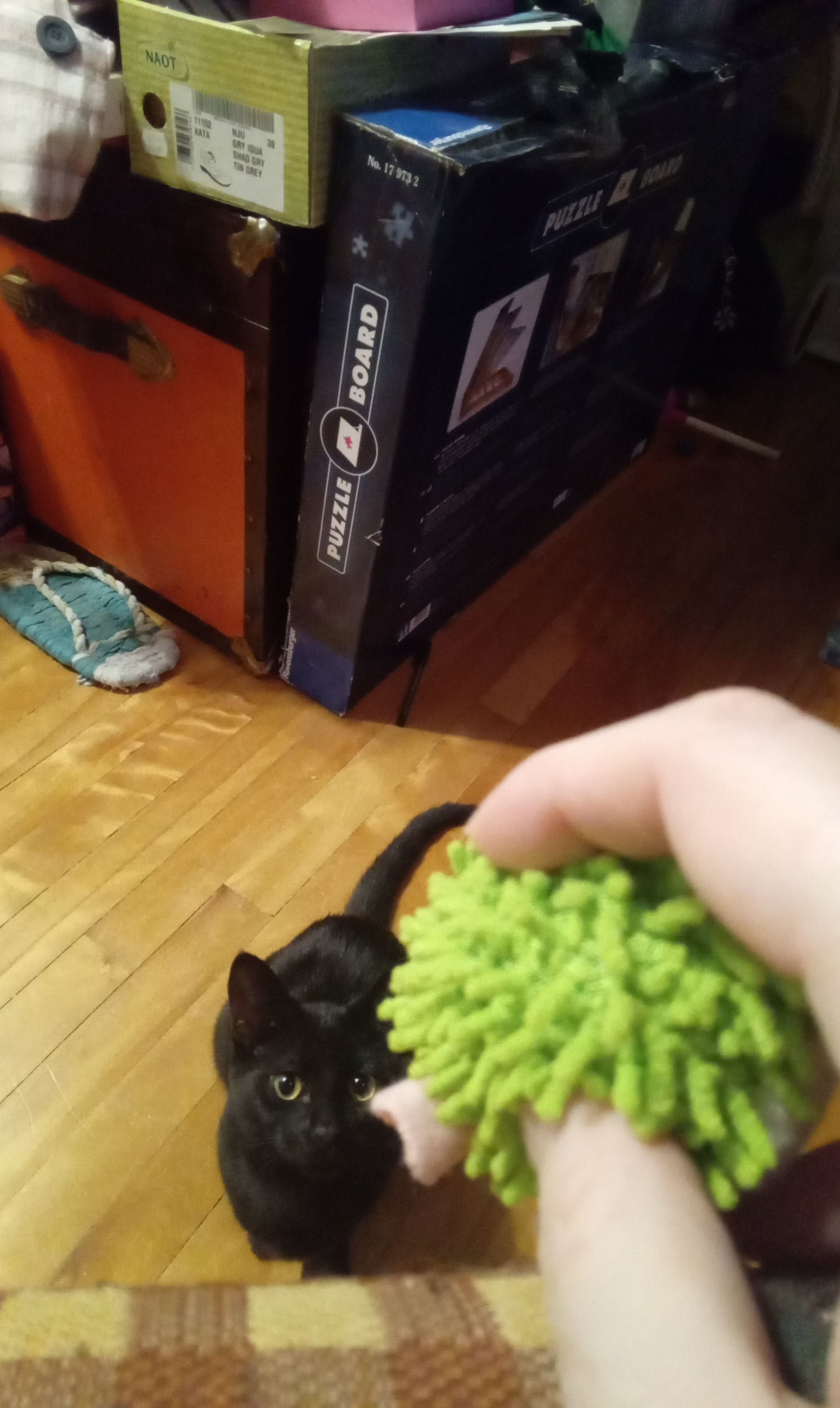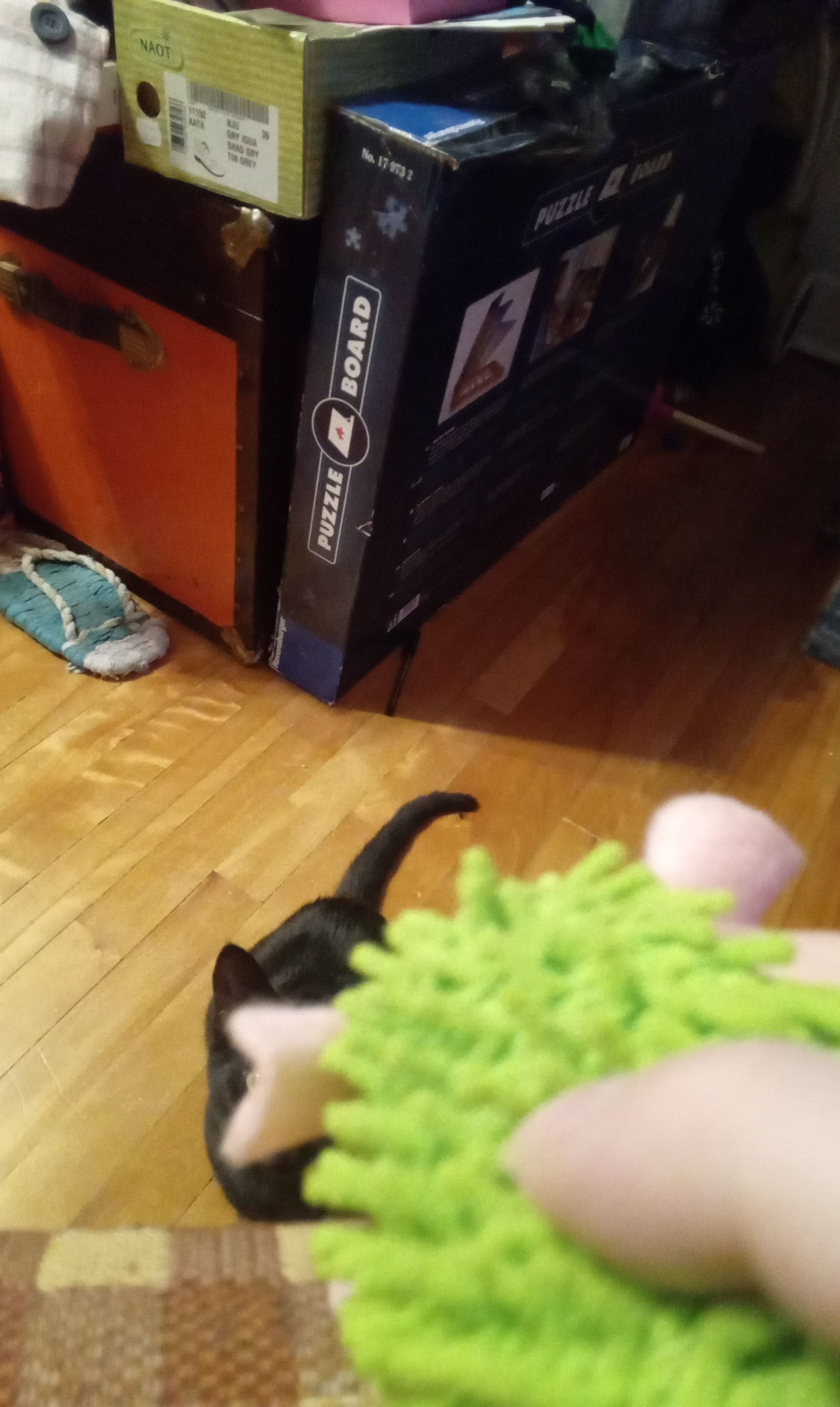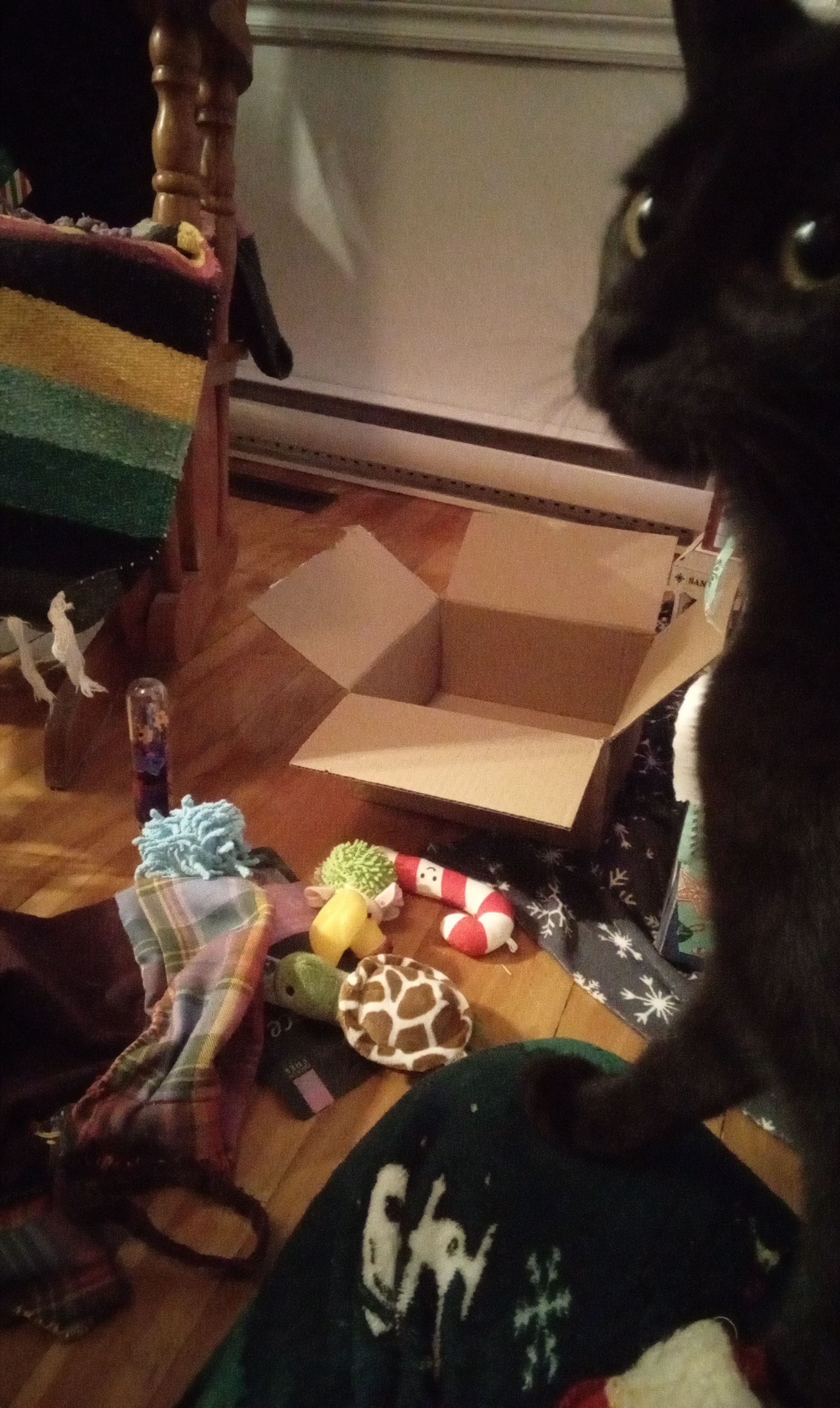 Bref, pour en revenir à Gigi, elle a eu droit à un bas de Noël et pas n’importe lequel, un que je lui ai fait maison à partir d’une vieille paire de pantalons usées et de retailles de tissu. Il n’est pas parfait, je l’ai fait très approximativement et éventuellement, il sera décoré, mais pas cette année. Il est un peu plus grand que prévu, on aurait pu la rentrer dedans, sauf qu’il était juste assez serré et qu’elle était trop éveillée quand nous avons tenté de l’y mettrre. J’avoue qu’une photo d’elle dans son bas, ça aurait été trop parfait ! Dans son bas, nous lui avons mis un sac de friandises et quelques nouveaux jouets. Elle n’a pas tout adoré également. La balle fuzzy bleue a été un hit pendant un bon bout, le hérisson vert, elle en a un identique qu’elle adorait déjà, la canne de bonbon, elle aime bien, la tortue un peu moins. Les friandises, des foies déshydratées ou séchées à froid, j’oublie, elle en raffole ! Ouvrir le bas en soi, ça l’a moyen intéressé, bien que ça l’a surstimulé. Quoi que nous avons ouvert nos bas peu après être rentrés à la maison, ça a dû influencer aussi.