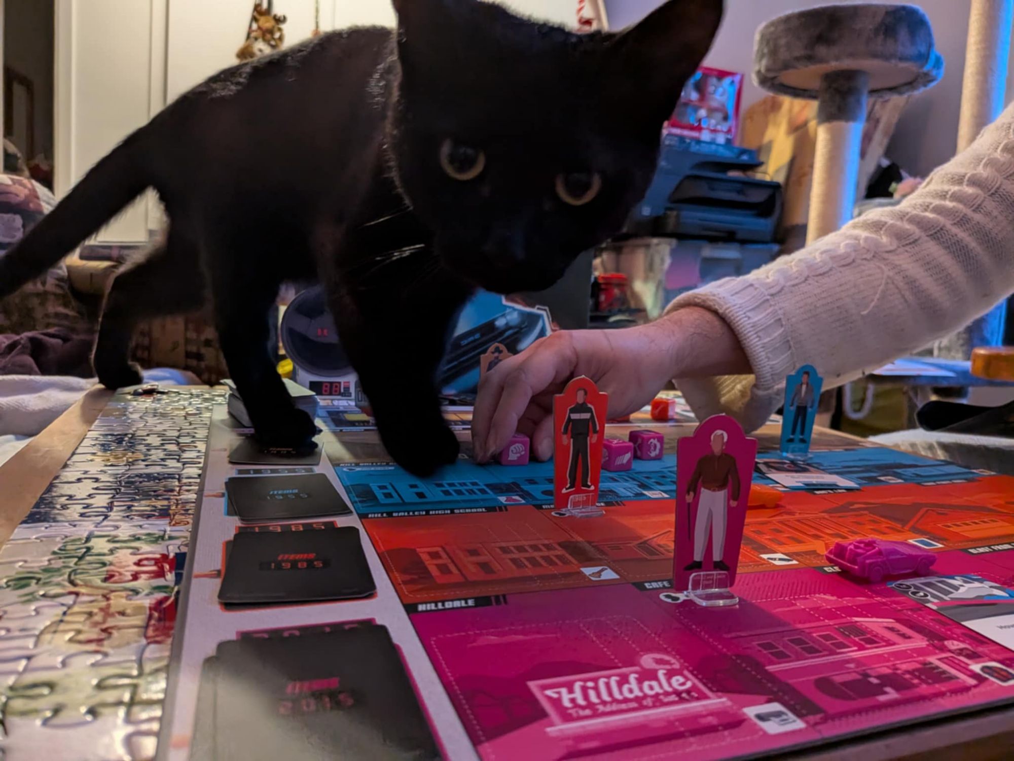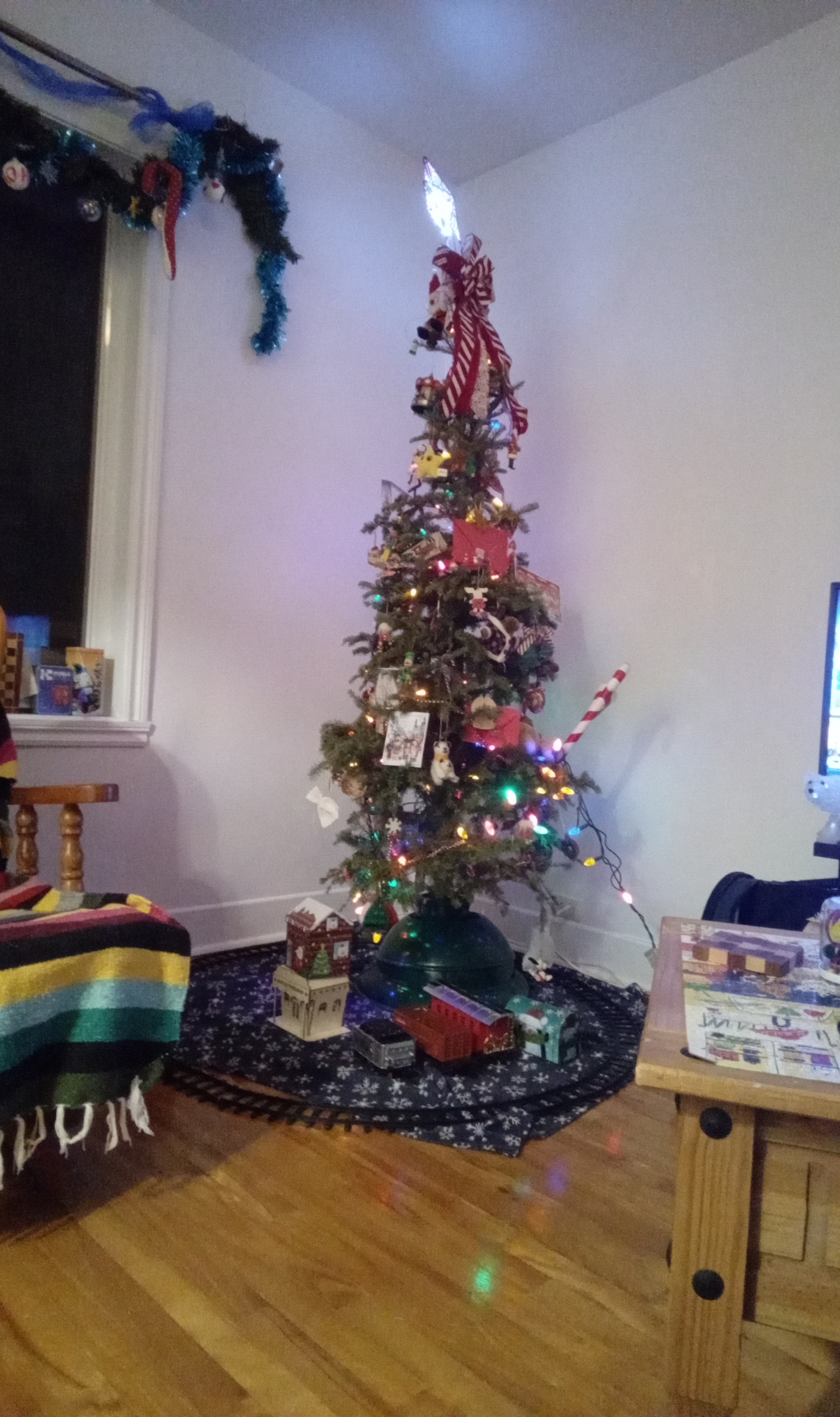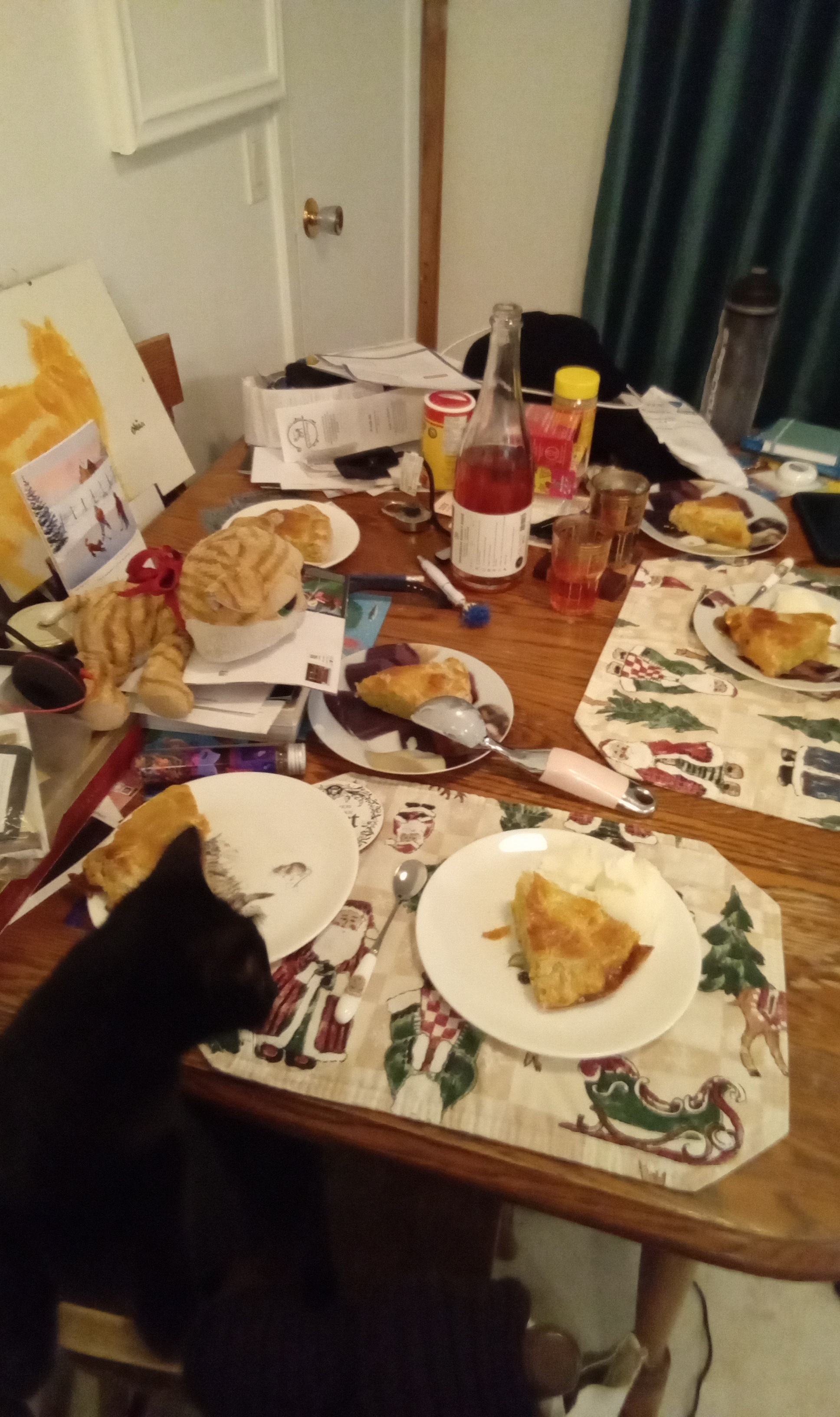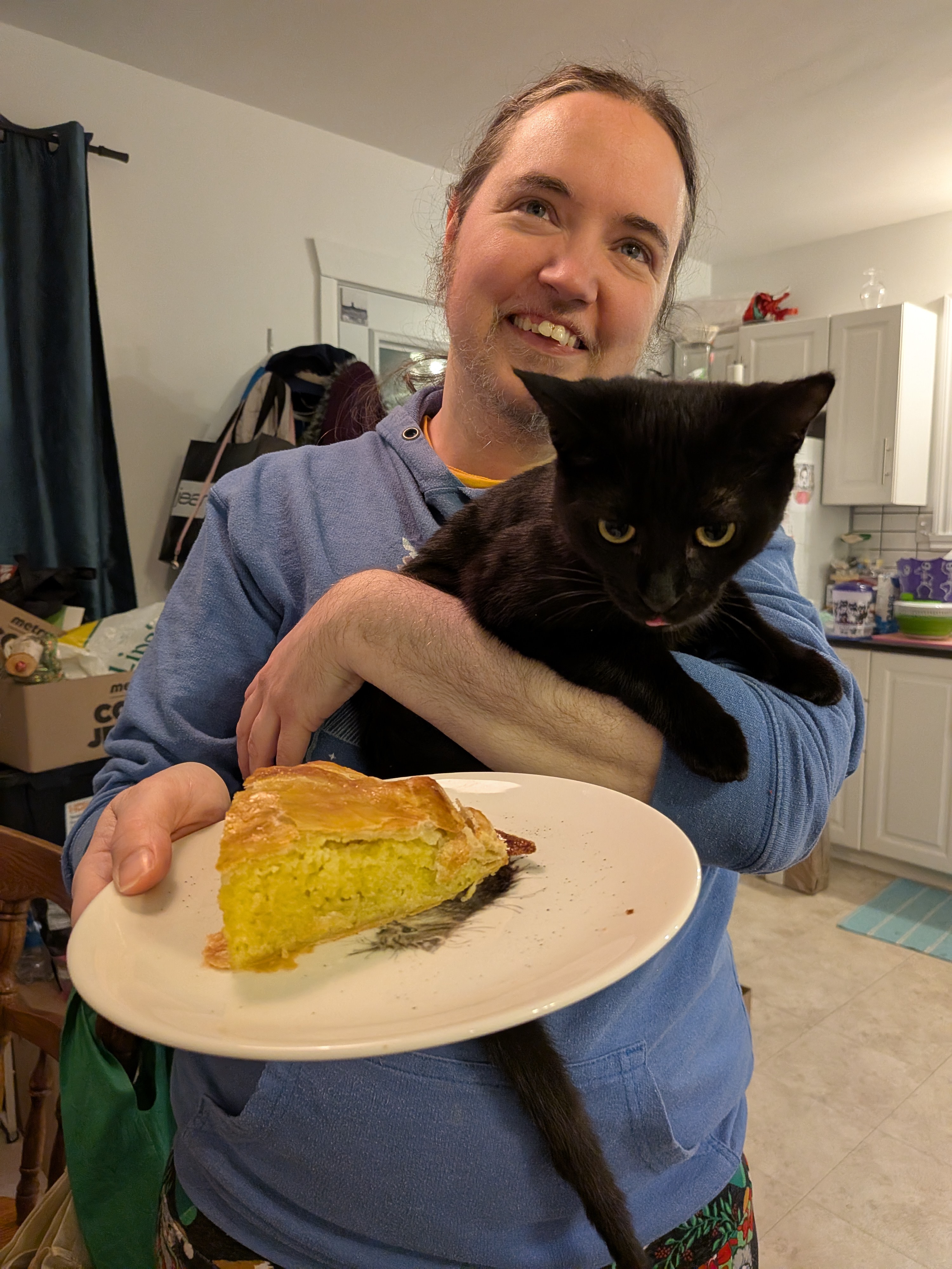 Le reste de cette période a été assez calme, surtout que j’étais un peu malade sur le retour de notre séjour en Montérégie, jusqu’au Jour de l’an. Il y a tout de même eu plus de moments de jeux en famille, de lecture, bien du repos, et bien sûr, la galette des rois quoi qu’elle est arrivée un peu tard. Gigi a eu droit à sa première part (symbolique seulement hein ? Je ne pense pas qu’il y a grand-chose de toxique pour un chat dans une galette à la frangipane traditionnelle, mais je ne testerai pas pareil). Il y en avait une pour Clément aussi. J’aurais adoré que la part de Gigi ou de Clément contienne la fève, toutefois, c’est moi qui ait croqué dedans. Si vous vous demandez, j’ai bien monté le train des Fêtes à nouveau, pas à temps pour Noël cependant. Cette année, ça a été un train du Nouvel An. Je ne l’ai pas tant fait fonctionné, Gigi avait un peu peur de lui et j’ai eu un peu de difficulté à gérer les rails là où le sapin était placé. J’étais quand même contente d’avoir pris le temps de le sortir, de le monter et de le faire rouler un peu. Rien ne m’empêche de le ressortir en cours d’année si ça me tente.