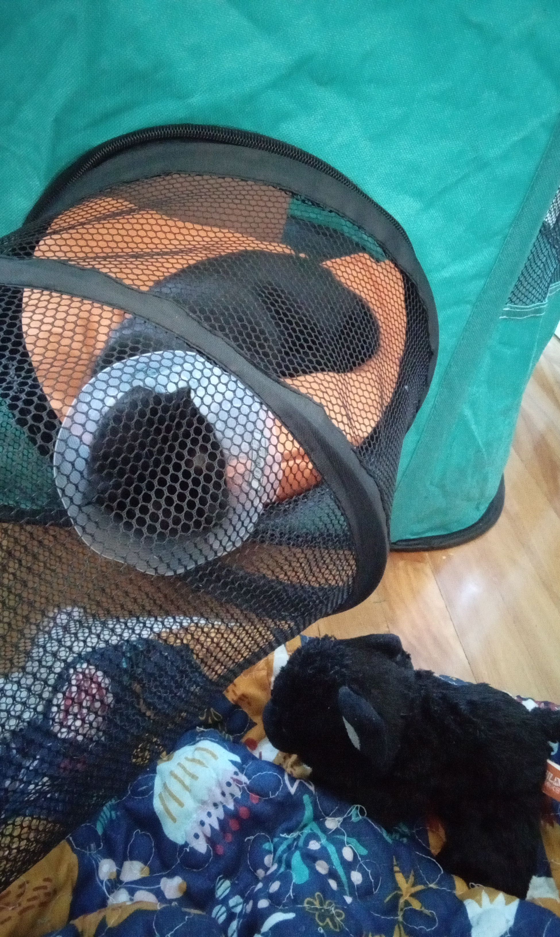 Au niveau des jeux aussi, nous avons modifié notre approche. Les premiers jours, nous n’encouragions nullement le jeu, comme le repos était de mise. Puis, nous avons réintroduit des jeux modérés. Dans son enclos, par hasard, j’ai découvert qu’un crayon pouvait être le meilleur jouet pour chat qu’il y a, en tout cas, pour notre princesse des bois. Je le posais sous ou sur le tunnel, et elle essayait de l’attraper, le poussant et repoussant sans cesse. Lorsqu’il était repoussé trop loin, je le rapprochais du tunnel, un peu plus loin d’elle. Elle avait quelques jouets dans son enclos dont une balle et son ami peluche Grim qui l’avait aussi accompagné à la clinique vétérinaire pour sa nuit sans nous. Grim, c’est son jumeau version peluche, encore plus que Clément II ne l’a été pour Clément, sauf qu’au contraire de Clément II, Grim est arrivé dans notre foyer avant la naissance de Gigi, et même bien avant la mort de Clément. Quoi qu’il n’a jamais été tout à fait un membre de la cour de Clément, plus un voyageur qui passait de temps en temps. Bref, je reviendrai là-dessus plus en détails plus tard. Elle aime bien jouer avec Grim et elle le faisait un peu dans son enclos. Elle semblait surtout apprécier sa présence se couchant souvent proche de lui.