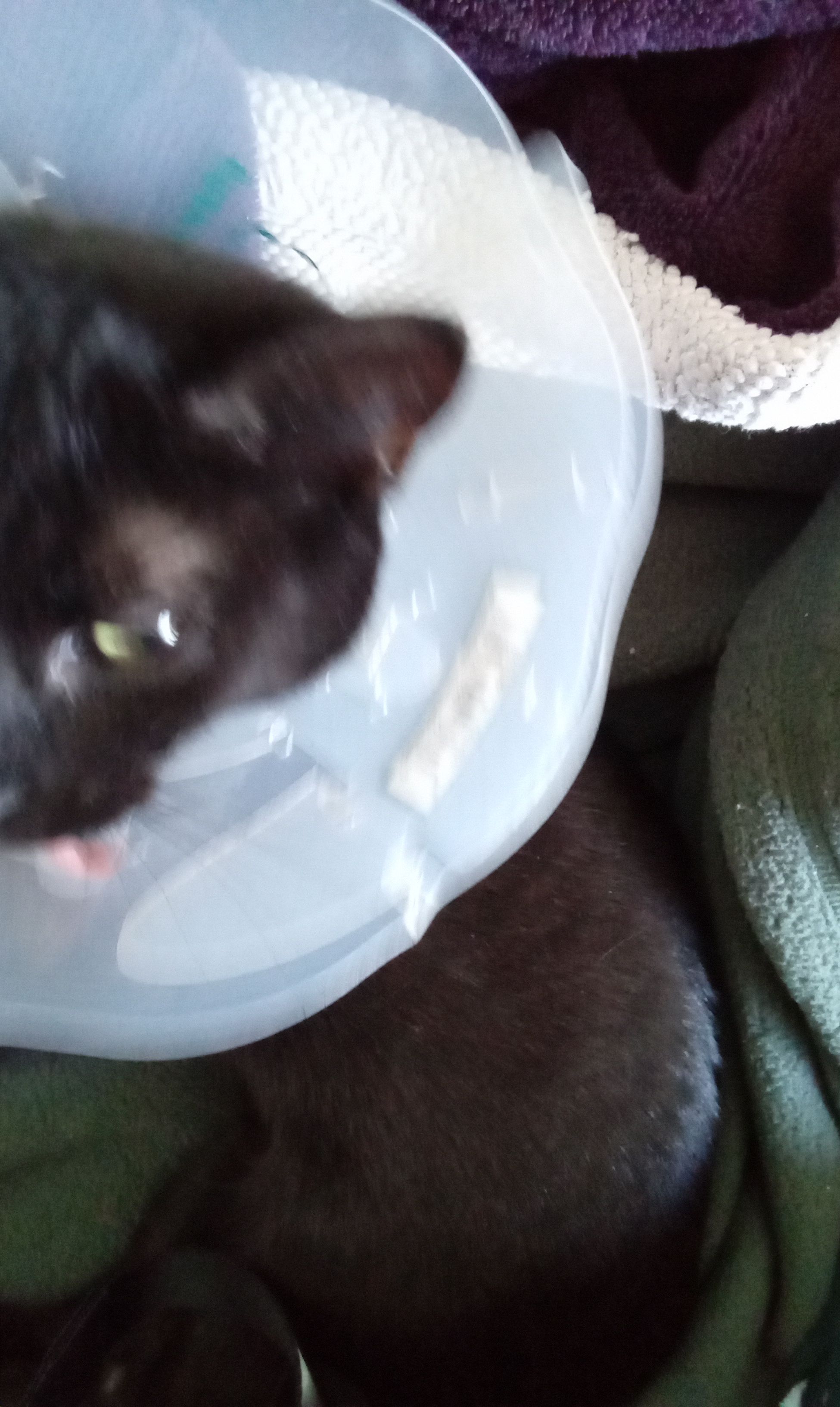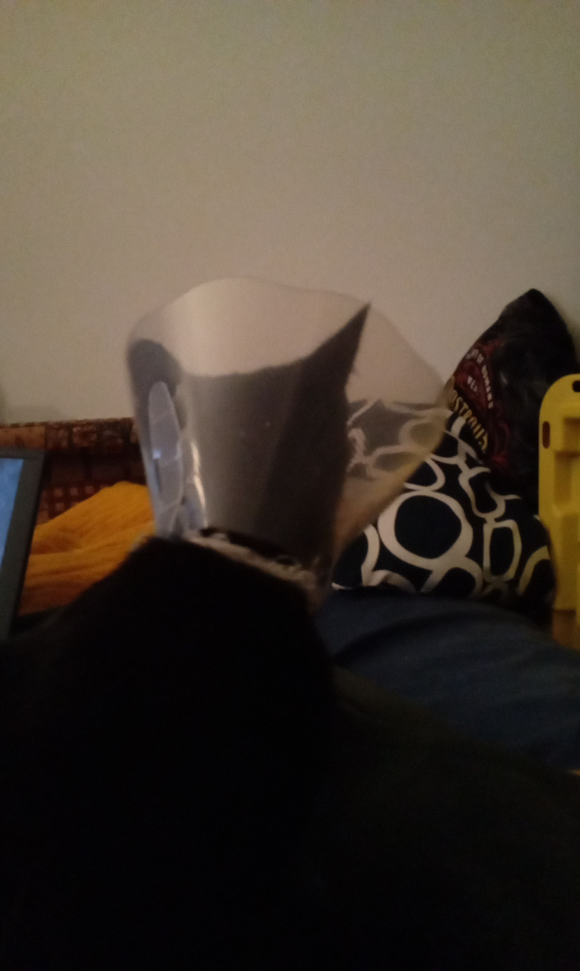 Gigi n’était pas très heureuse de la situation, quoi que je pense que le port de la collerette la dérangerait plus que le confinement. Nous avons fait de notre mieux pour la traiter aux petits oignons, avec pleins de caresses, des friandises à tous les jours, du brossage avec le gant de toilettage qu’elle adore et juste beaucoup d’attention. Nous nous installions souvent au sol pour être à sa hauteur. Je pense que ça a bien servi de réduire son territoire momentanément. Elle s’est ainsi amplement reposée durant les premiers jours et l’espace réduit semble avoir eu un certain aspect réconfortant pour elle. Elle a pu apprivoiser le déplacement avec le collier Elisabéthain dans un espace limité ce qui fait que lorsqu’elle en est enfin sortie, elle était assez habituée à se déplacer et à percevoir son environnement à travers. Nous avons aussi fait quelques ajustements avant de la laisser sortir pour limiter les opportunités de saut et d’alpinisme félin. La chambre principale lui est restée inaccessible pendant plusieurs jours encore, presque jusqu’à la fin de sa convalescence, notre lit étant vraiment haut. J’ai dormi dans le salon avec elle jusqu’à la fin de sa convalescence. Le futon-lit est moins haut que notre lit, néanmoins, il était quand même un peu haut, alors, je lui avais installé des petites marches des deux côtés du futon et elle les a adoptées assez vite. Nous avons rangé ou bloqué son accès aux autres meubles sur lesquels elle pouvait sauter, comme le pouf bleu, trône de son grand frère.