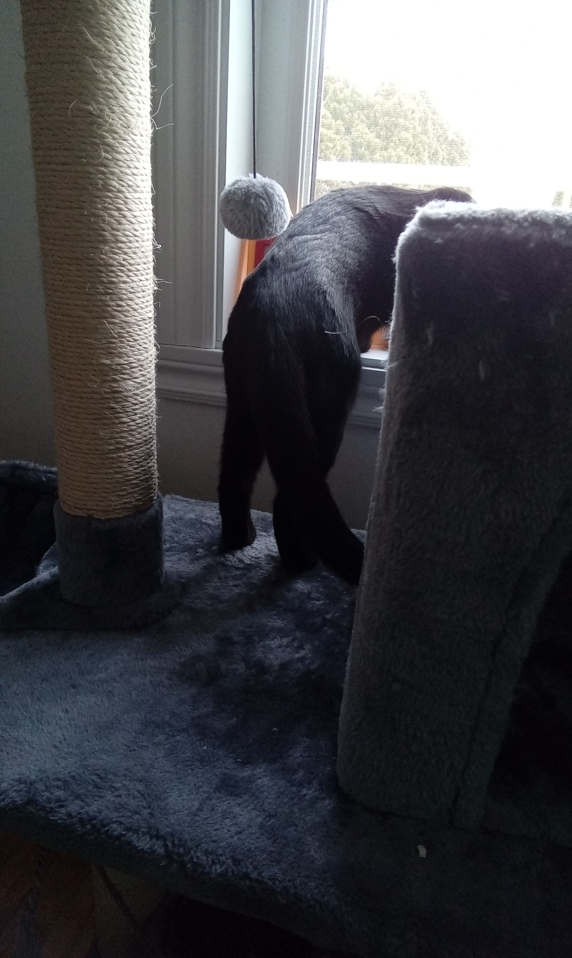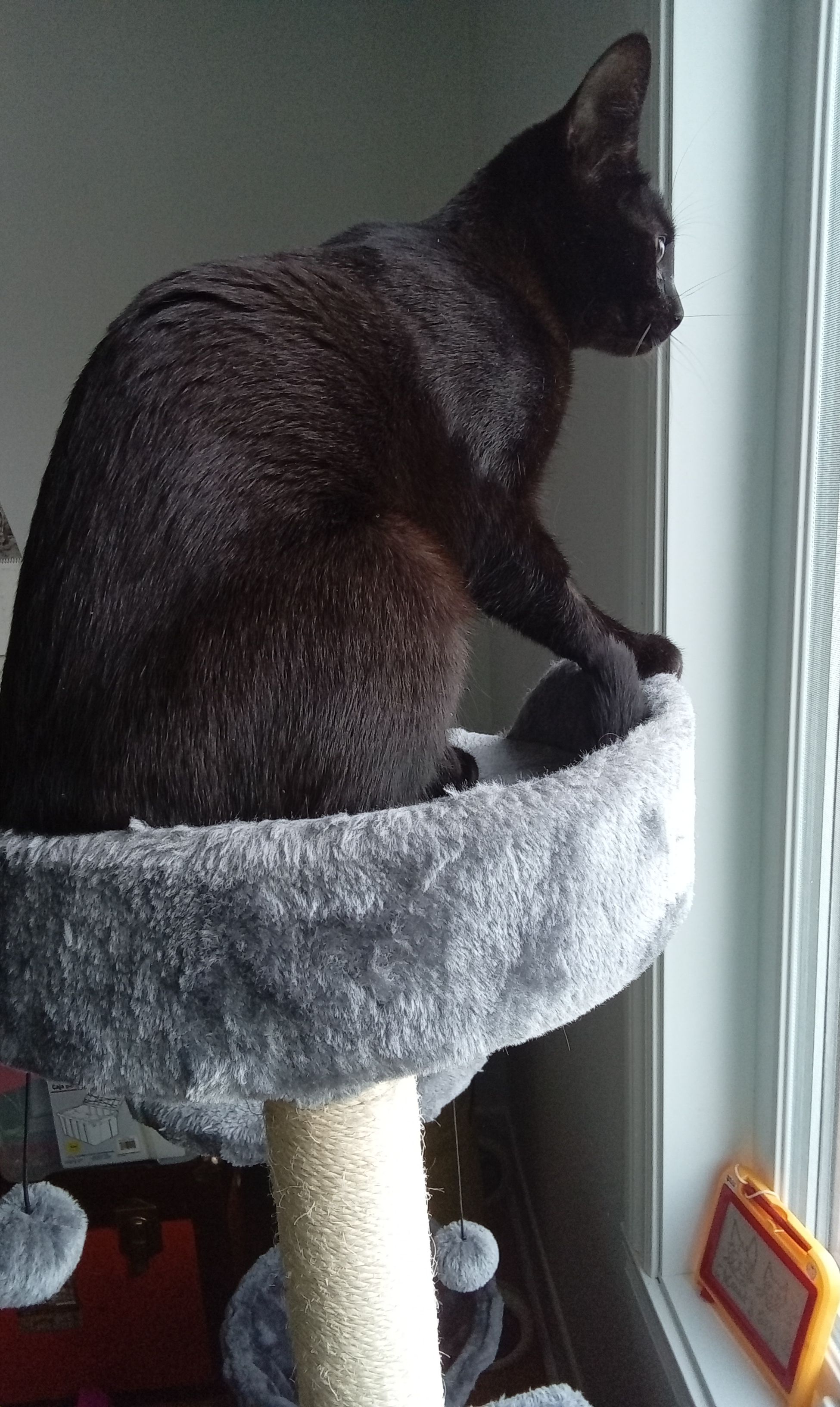 Une fois qu’elle a commencé à sortir de l’enclos durant le jour, le type de jouet auquel elle avait accès était encore limitée. Pas de rubans, cordelettes et autres ficelles qui pourraient la faire sauter dans les airs, pas de balles qui roulent trop vite, ce qui la pousseraient à sprinter d’un bout à l’autre de l’appartement. Elle avait ses petits amis pelucheux, quelques balles plus lourdes ou légères qui ne roulent pas très loin, et pas très vites, et bien sûr, crayons et stylos qui encore maintenant, font partie de sa routine de jeu. Après le retrait de ses points de suture et de la collerette, Gigi a repris les jeux un peu plus actifs, mais progressivement. En partie, c’étaient encore nous qui la limitions, malgré qu’elle s’est elle-même limitée aussi, probablement un mélange de reprendre ses repères, de retrouver son équilibre sans le collier encombrant et aussi de réchauffer ses muscles quelque peu assoupis. Nous n’avons pas immédiatement sorti l’arbre à chat, question de nous assurer qu’elle était bien remise. Le jour où l’arbre de chat est réapparu, que notre princesse des bois était heureuse !