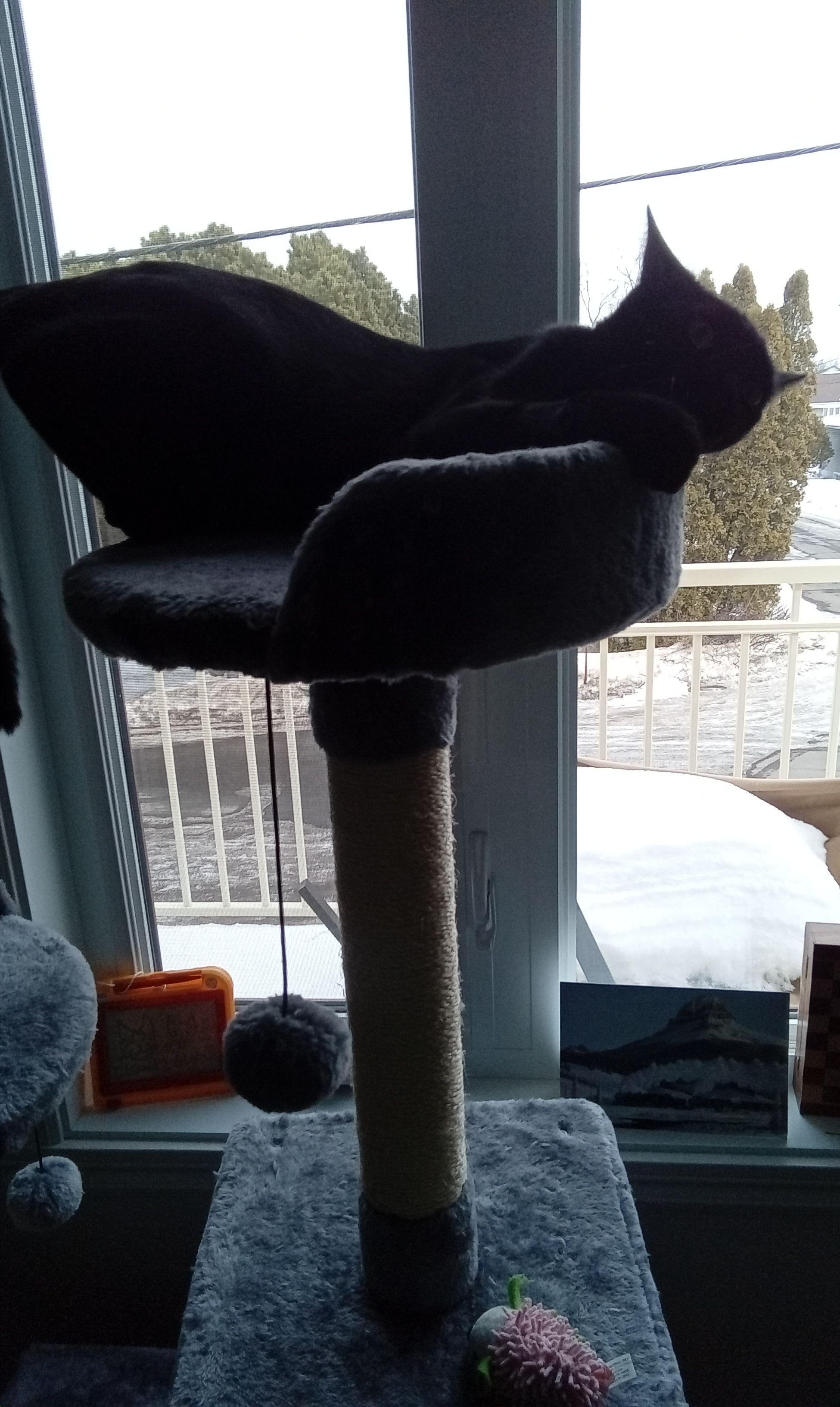 En février, ce qui me tirait le plus de jus était bien sûr, ou du moins, j’imagine sans surprise, la convalescence de Gigi. Celle-ci a été assez différente de celle de Clément. Déjà en partant, la nature de l’opération entre un mâle et une femelle n’est pas la même, le besoin de ménagement et de repos, bien que similaire, est encore plus essentiel pour les femelles où la cicatrice est sur le bas-ventre et le risque de réouverture lors de gestes routiniers comme sauter ou grimper sur son arbre à chat est élevé. Ainsi, nous avons rangé l’arbre à chat dans une pièce fermée. Nous avons aussi opté pour confiner Gigi durant ses premiers jours de retour à la maison. Aucune des pièces avec porte dans l’appartement ne se prêtait vraiment à une convalescence suffisamment sécuritaire (trop de réaménagement requis pour limiter les opportunités de grimper et sauter), nous avons sorti l’enclos avec tunnel qui avait servi lors de son premier voyage hors de la maison, à Noël. Il a été installé dans le salon où le divan-futon a été déplié pour que je lui tienne compagnie durant la nuit.